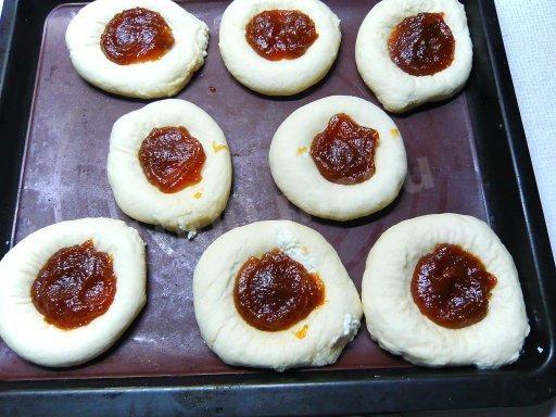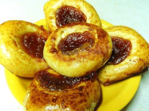I wypełnij to zagłębienie powidłami rozcieńczonymi wodą (nie powinno być płynne). Serniki posmarować ubitym jajkiem i pozostawić w ciepłym miejscu na pół godziny. Jeszcze raz posmaruj jajkiem. Piec w piekarniku w 180C przez 25 minut.