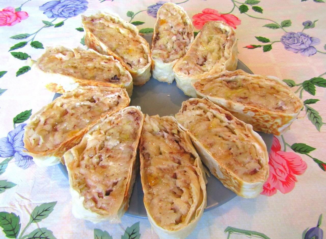 Zaczynamy zbierać bułkę. Na stole kuchennym układamy chleb pita i nakładamy pierwszą warstwę twarogu ze śmietaną. Rozprowadzamy równomiernie po całym chlebie pita, pozostawiamy Pasek chleba pita o szerokości 8-10 cm niewypełniony nadzieniem, a drugą warstwę – jabłko-równomiernie nakładamy zużytą masę jabłkową na warstwę twarogu. Trzecią warstwą rozprowadzamy posiekane orzechy włoskie.