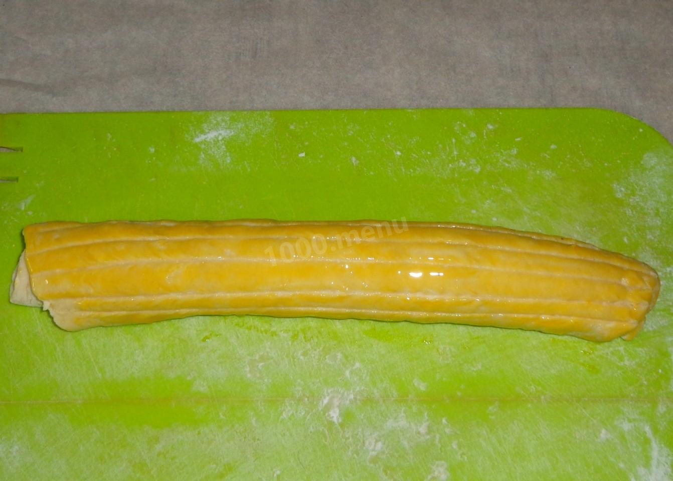 Zwinąć mocno rolką. Posmaruj go żółtkiem za pomocą pędzla do gotowania. Za pomocą noża nałóż płytkie paski wzdłuż kawałka.