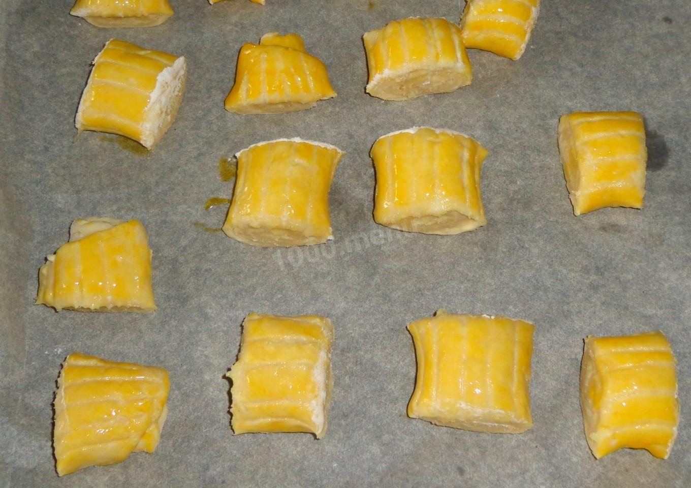 Ostrym nożem pokrój rolkę na kawałki o wielkości 2-3 cm. Przykryj blachę do pieczenia papierem do pieczenia. Rozłóż puste miejsca w pewnej odległości od siebie.
