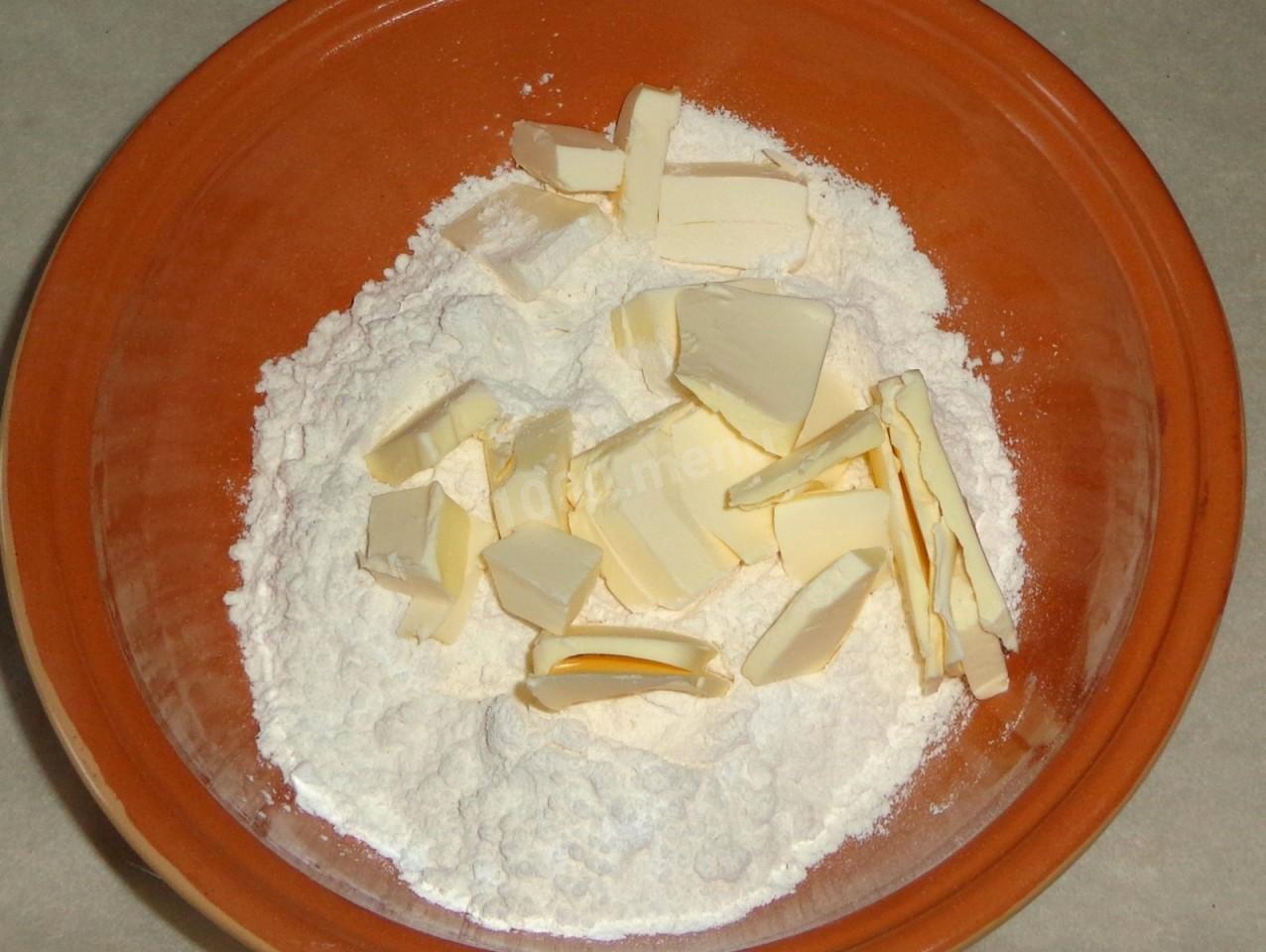 Pokrój miękkie masło na kawałki, Wyślij do mąki. Zmiel palcami w drobny okruch masła.