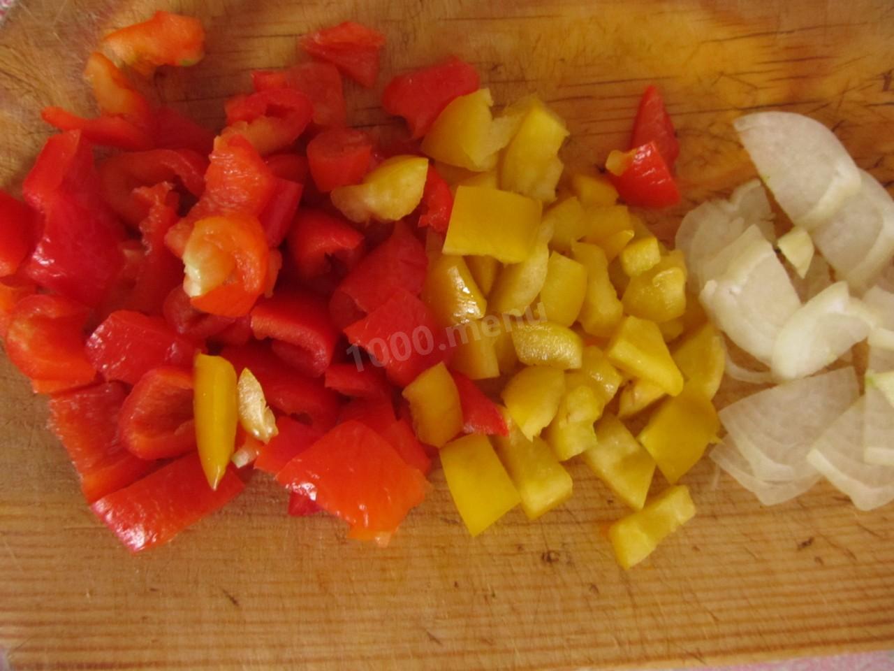 Pokrój paprykę w kostkę, wziąłem połowę czerwonej i żółtej papryki. Pokrój cebulę cienko.