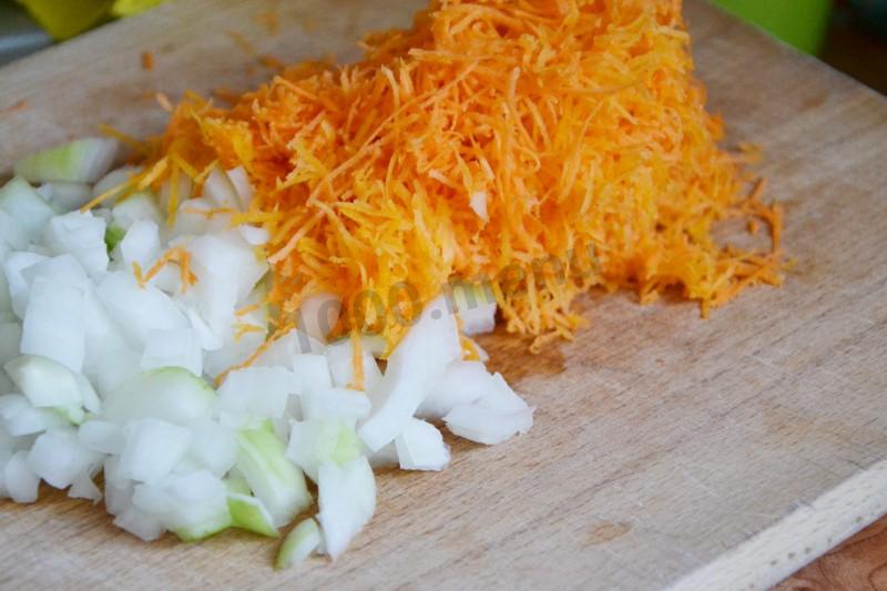 Pokrój cebulę w kostkę, trzy marchewki na tarce. Smaż warzywa na oleju roślinnym do miękkości.
