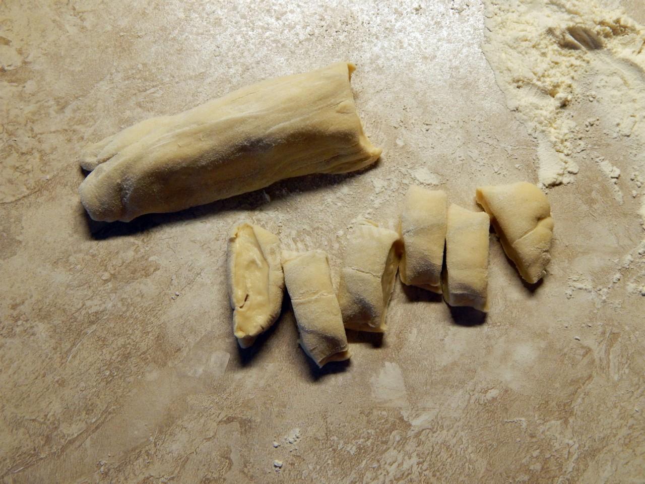 Wyjmij ciasto, podziel je na dwie części. Możesz rozwałkować ciasto na cienką warstwę, a następnie wyciąć koła z ciasta szklanką. Ale te mają grube krawędzie. Lepiej zrobić to w sposób, który jest nam znany w Rosyjski sposób, jak robią pierogi. Z ciasta rozwałkuj kiełbasę, pokrój na kawałki o szerokości około 3 cm.