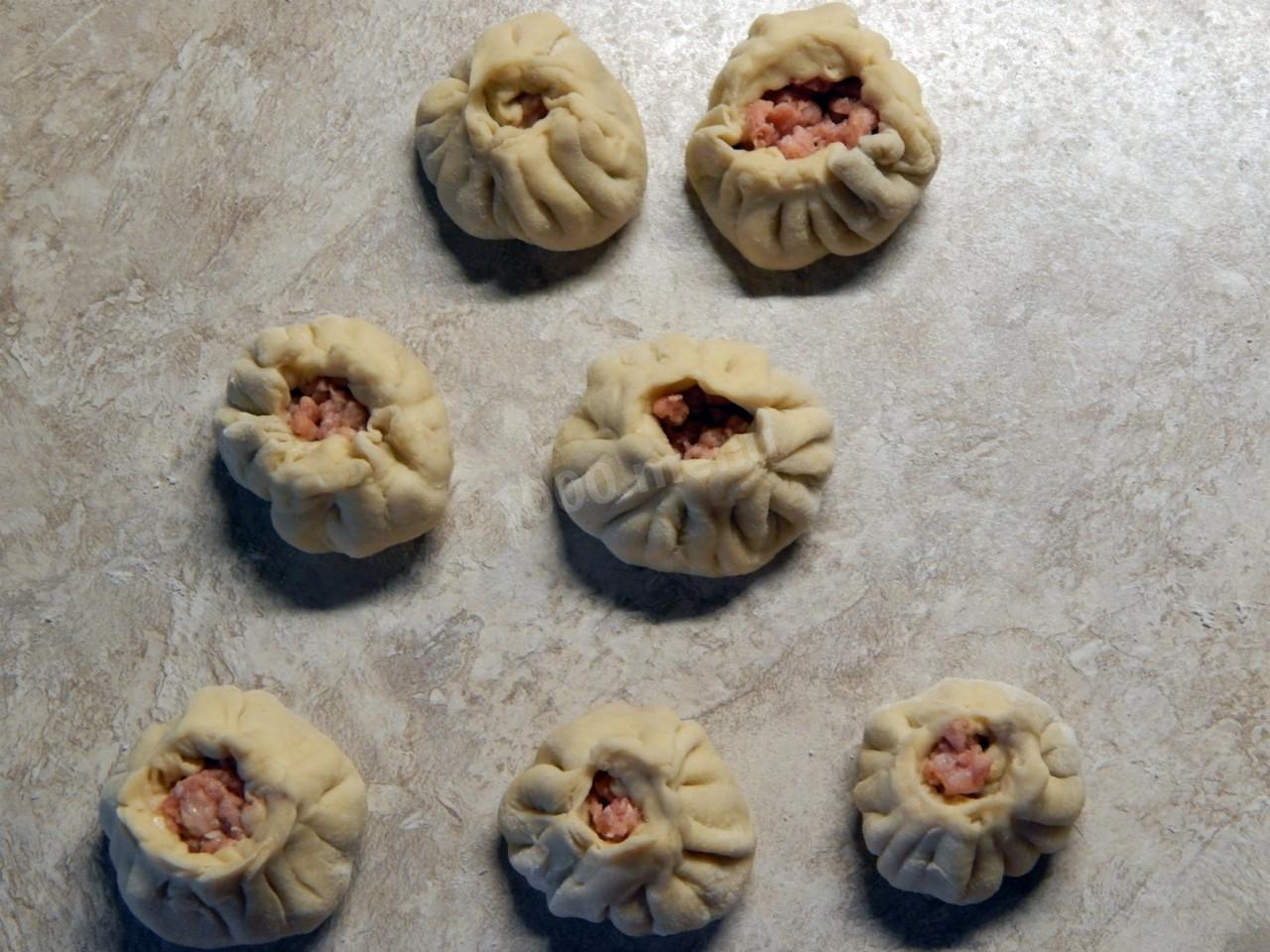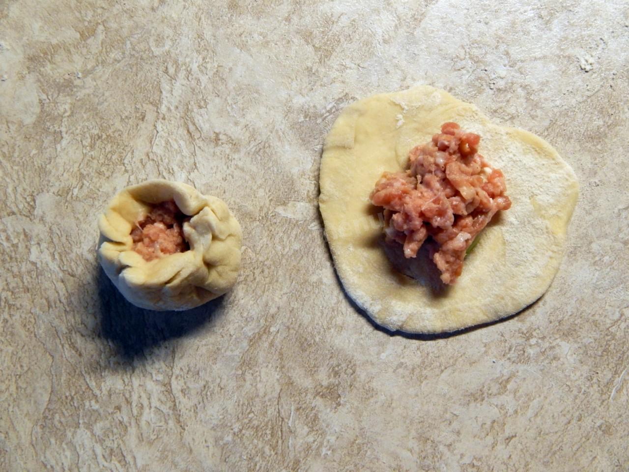 Weź tę tortillę w lewą dłoń. Łyżką umieść mięso na środku tortilli i zacznij szczypać palcami prawej ręki krawędzie ciasta, tworząc z nich fałdy. W środku pozostaw otwór na ucieczkę pary podczas gotowania.