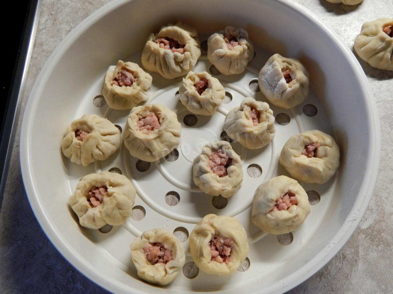 Zanurz gotowe buuzy dnem w oleju i włóż do formy do gotowania na parze. Gotuj na parze przez około 40 minut. Parowiec można zastąpić mantovarem lub powolną kuchenką z funkcją gotowania na parze.