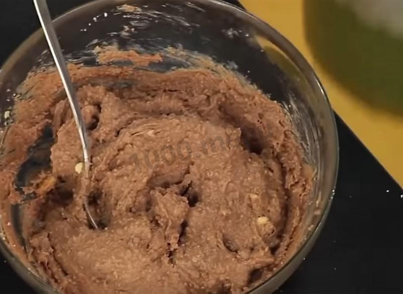 Dodaj mleko skondensowane i kakao i zagniataj (powiedzmy) ciasto, prawie na końcu dodając duże kawałki ciastek.