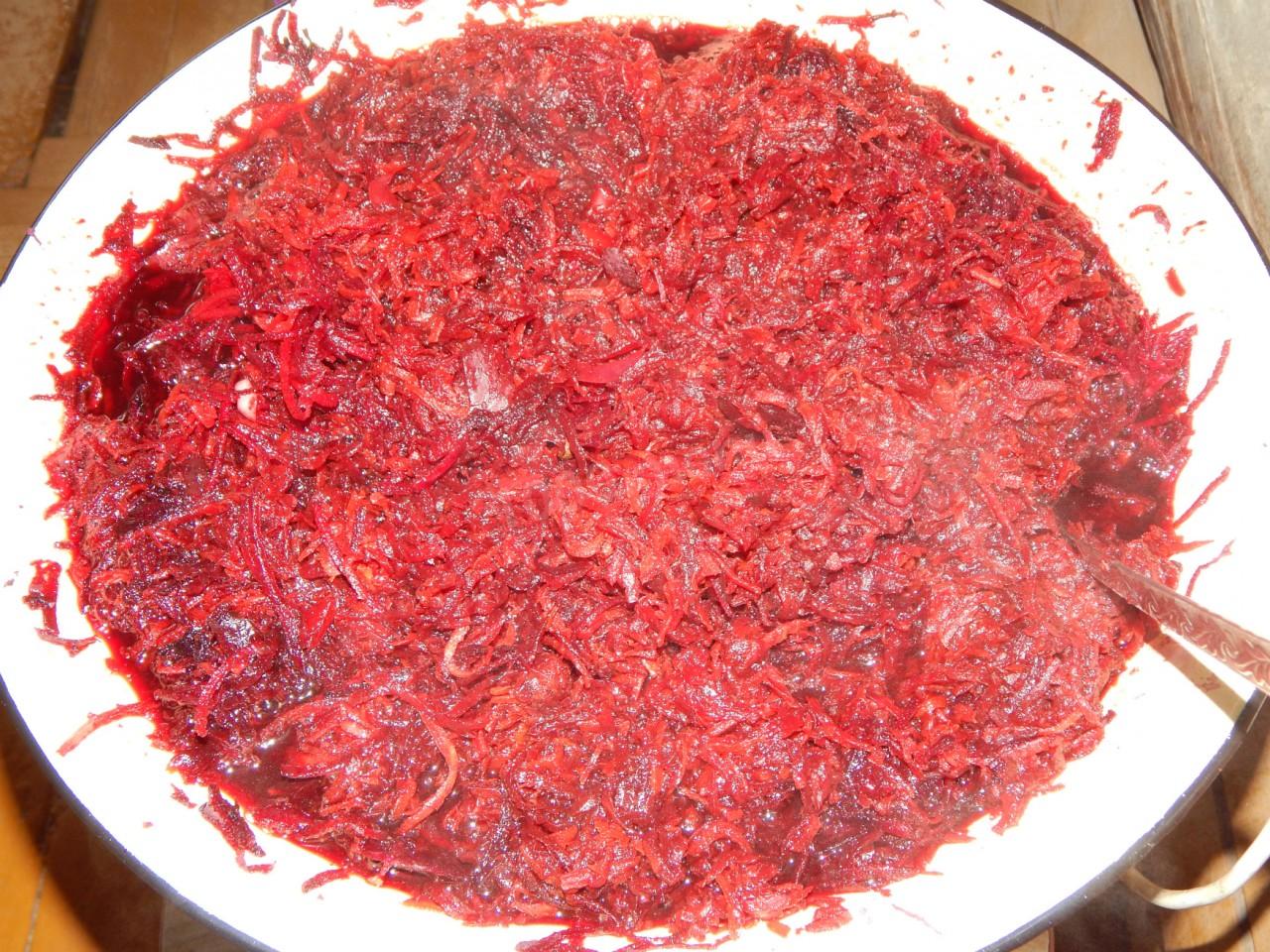 Wlej olej roślinny do dużej miski lub garnka z grubym dnem. Kładziemy posiekane warzywa: buraki, marchew i cebulę, mieszamy, aby warzywa były dobrze nasycone olejem. Wlej połowę octu i wody, wymieszaj, podpal. Doprowadzić mieszaninę do wrzenia, zmniejszyć do średniego ciepła i gotować na wolnym ogniu przez około 30 minut.