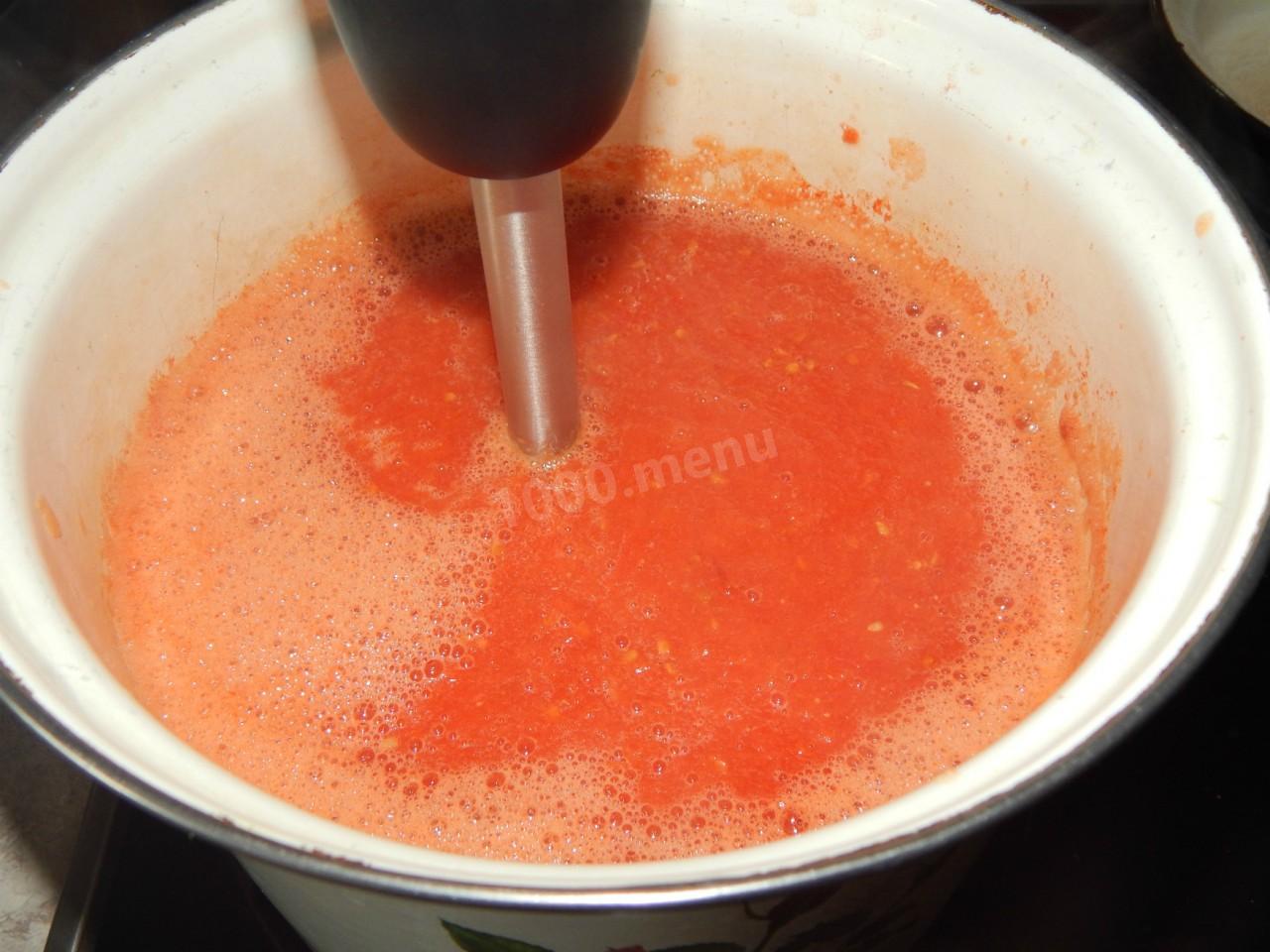 Włóż pomidory do miski i uderz blenderem. Jeśli nie ma blendera, możesz usunąć skórki z owoców wrzącą wodą i pokroić na kawałki nożem.
