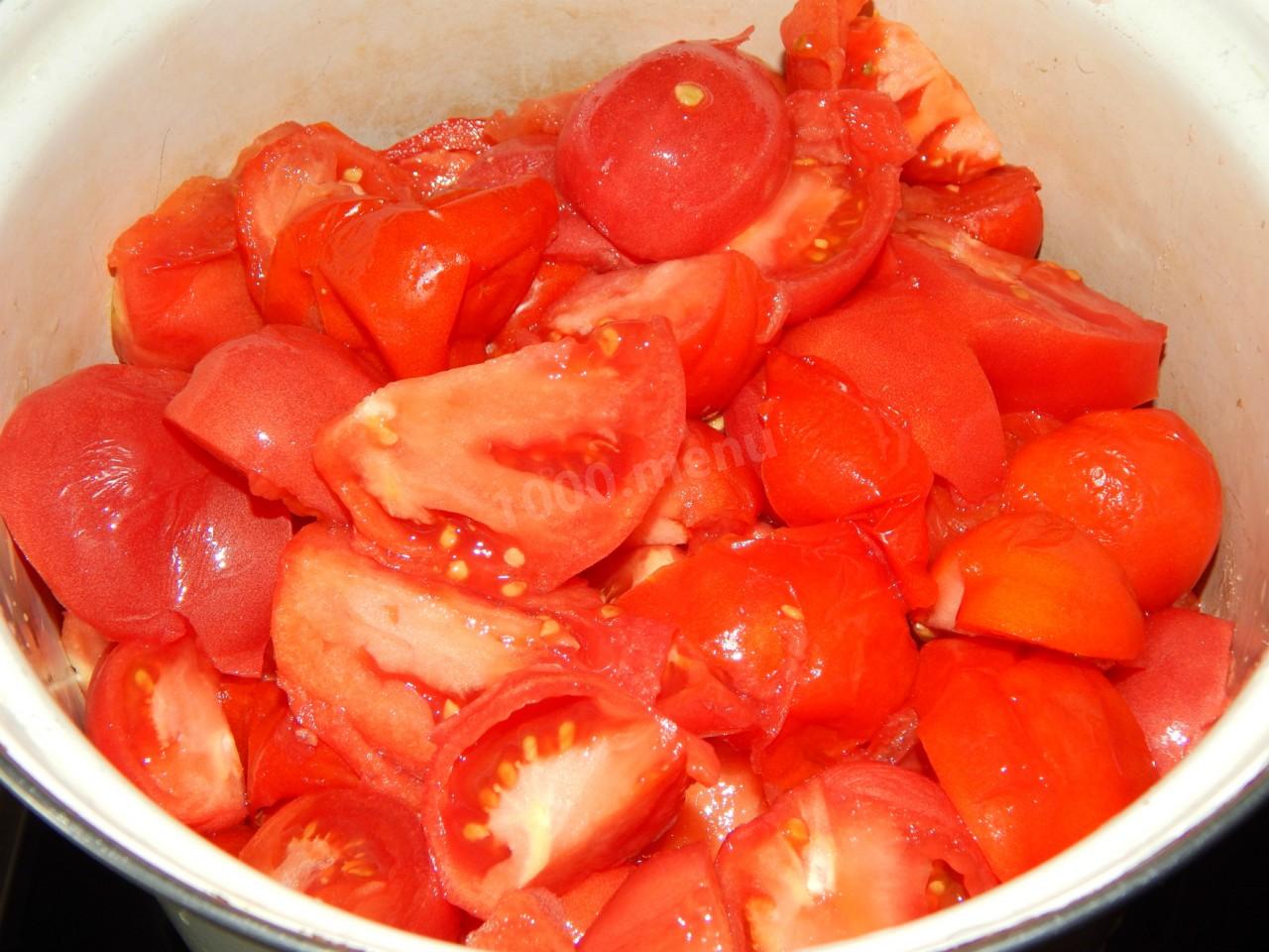 Gdy warzywa wypuszczą sok, dodaj pomidory, cukier, sól, przyprawy (z wyjątkiem liścia laurowego), pozostały ocet i wodę, wymieszaj. Przykryj pokrywką, ponownie zagotuj, zmniejsz ogień do średniego i gotuj na wolnym ogniu przez około 20 minut. Dodaj liść laurowy, wymieszaj i gotuj na wolnym ogniu przez kolejne 10 minut. Wstępnie przygotowujemy słoiki do przedmiotu obrabianego: myjemy i sterylizujemy w zwykły sposób-w łaźni wodnej lub w piekarniku, gotujemy pokrywki.