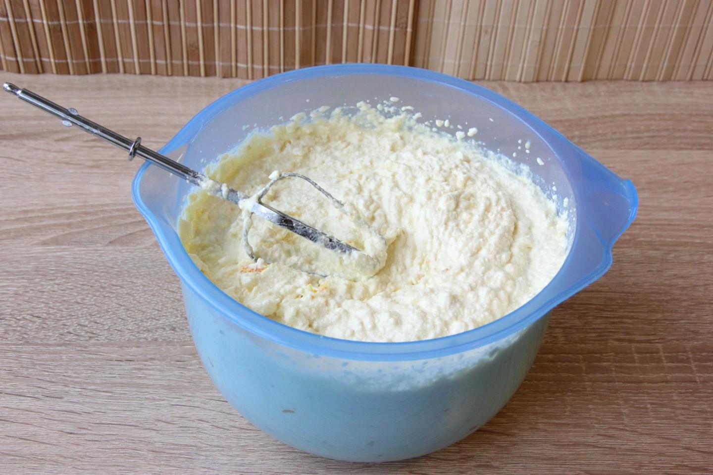 Wprowadź kawałki twarogu, nadal ubijając, aż będzie puszysty.