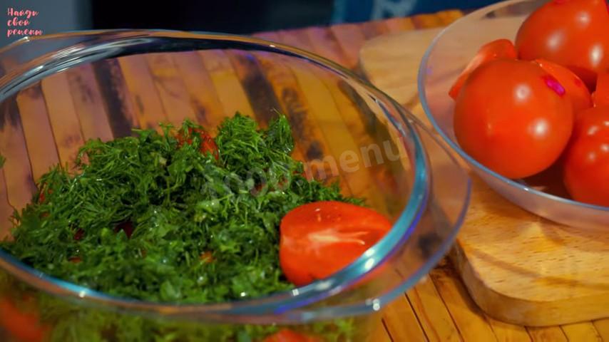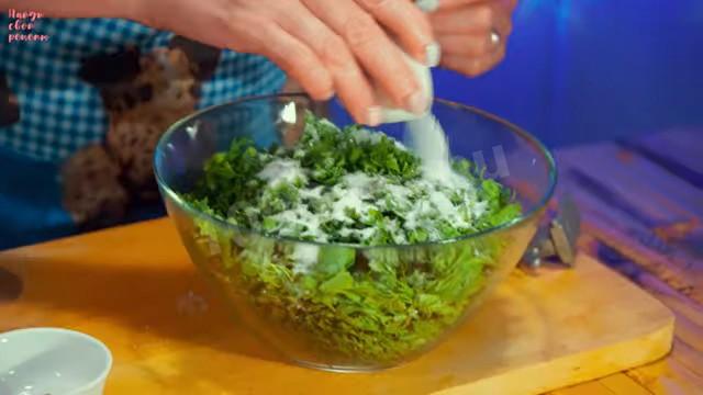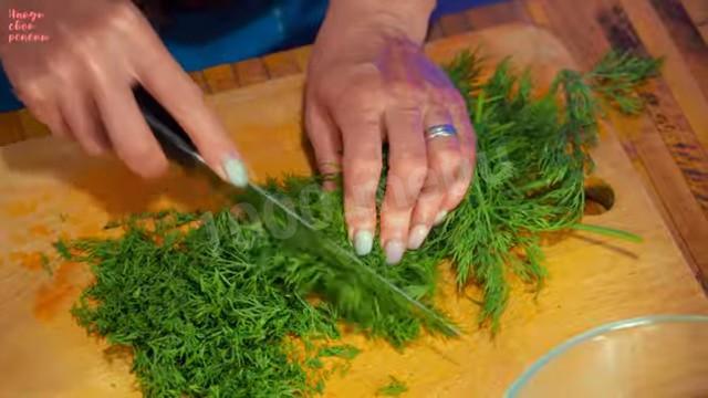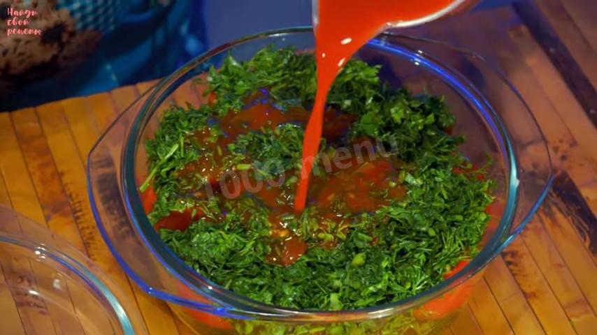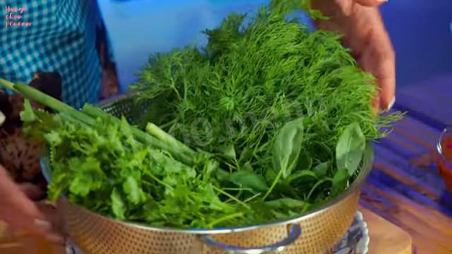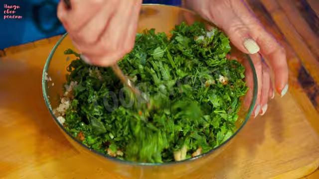 Drobno posiekaj i posiekaj sto gramów kopru, sto gramów kolendry, sto gramów pietruszki, sto gramów zielonej cebuli i włóż do odpowiedniej miski.