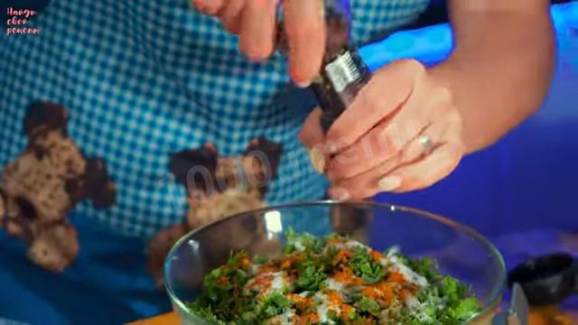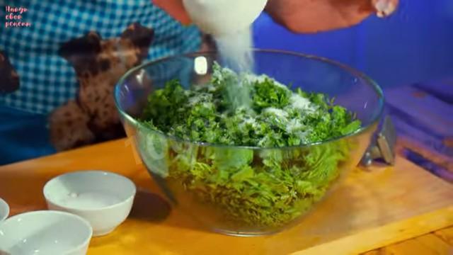 Dodaj łyżkę soli do miski z posiekanymi ziołami.