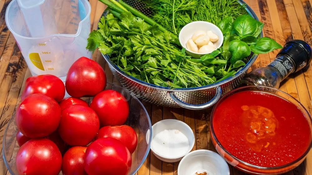 Aby przygotować pyszną przekąskę z pomidorów, która dobrze nadaje się do grilla i różnych dodatków, przygotowujemy niezbędne produkty.