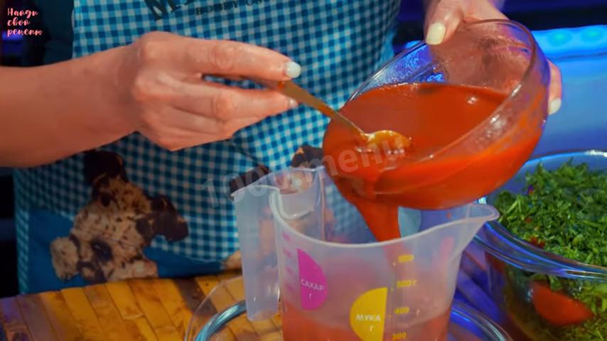 Wlej czterysta mililitrów zimnej przegotowanej wody do miarki, a następnie wlej do niej pięćset mililitrów przecieru pomidorowego.