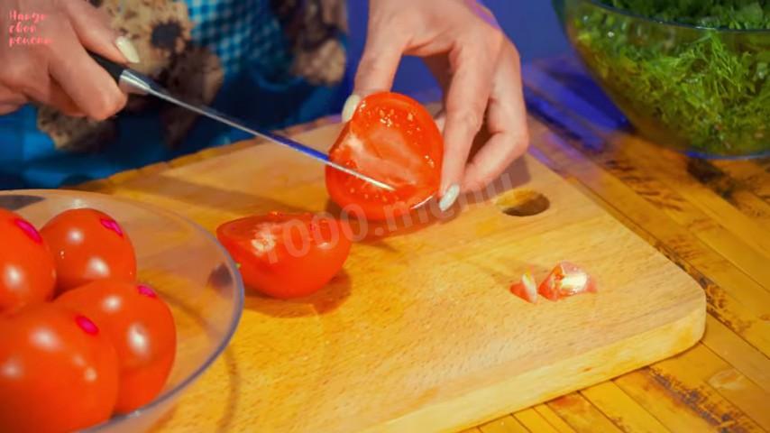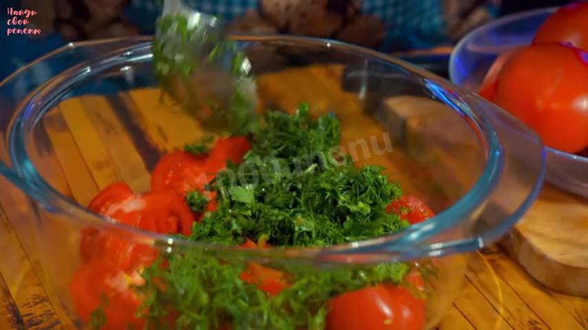 Posyp pomidory w misce obfitą warstwą zieleni.