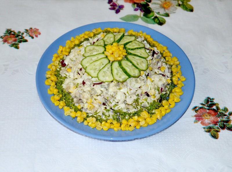 Połóż gotową sałatkę na talerzu ze zjeżdżalnią. Udekoruj kukurydzą, koperkiem, ogórkiem. Lub według własnego uznania.