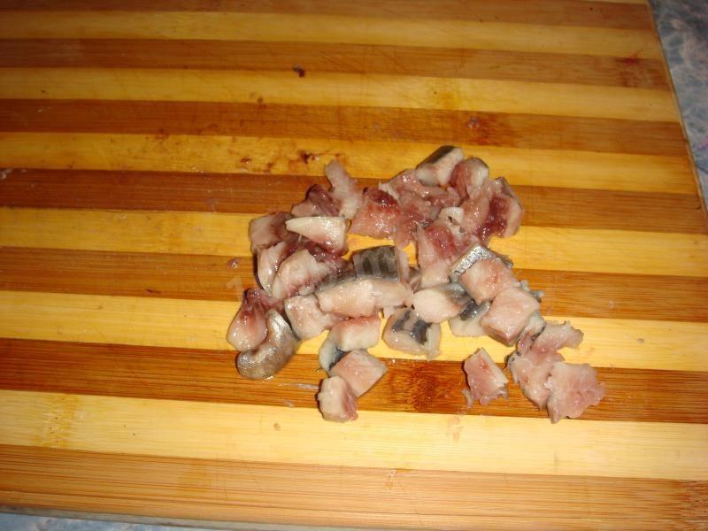 Przygotuj śledzie. Odetnij głowę, ogon i płetwy, usuń skórę. Przecinamy brzuch i patroszymy: wyjmujemy jelita, mleko lub kawior, a także usuwamy czarny film nożem. Usuwamy grzbiet i pozostałe kości, aby uzyskać filet. Możesz kupić gotowy filet śledziowy w słoikach.
