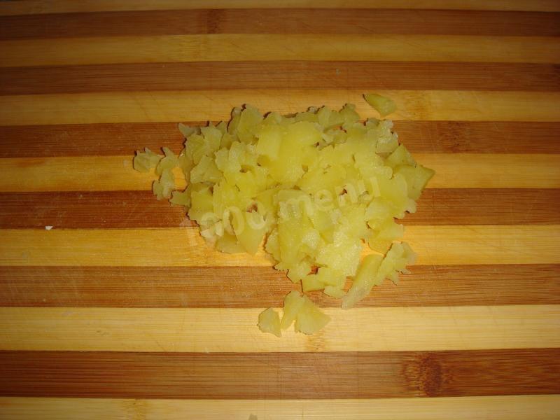 Jednocześnie z ziemniakami w jednym rondlu gotuj marchewki przez 30 minut. Chłodzimy, obieramy i kroimy w kostkę taką samą jak ziemniaki.