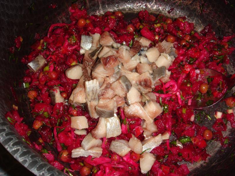 Dodaj posiekany filet śledziowy i ponownie wymieszaj. Dodaj sól i czarny pieprz do smaku i wlej nierafinowany olej roślinny, ponownie wymieszaj i spróbuj sałatki do smaku.