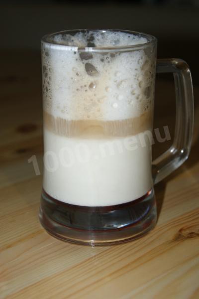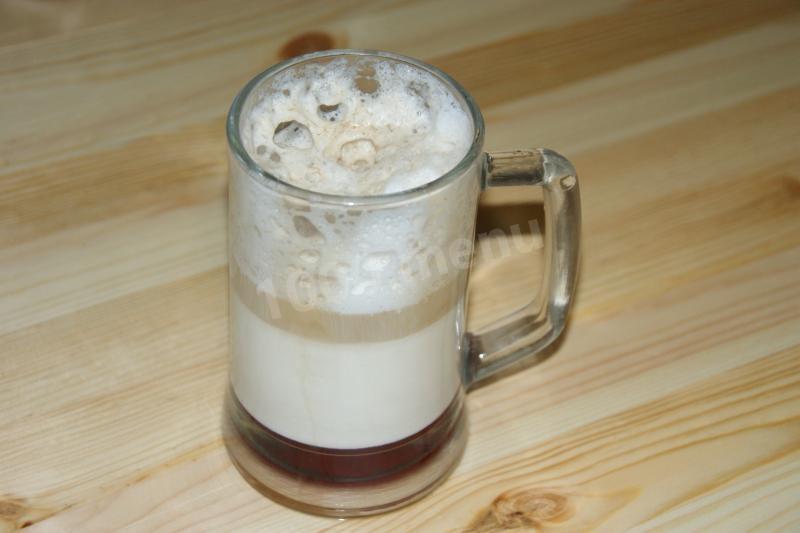 musisz ubić i podgrzać mleko, aby była piana. Przygotowujemy czarną kawę w dowolny sposób, oczywiście lepiej, jeśli ją ugotujesz. Syrop wlewa się na dno wysokiej szklanki, następnie mleko z pianką, a na koniec ostrożnie wlej kawę.