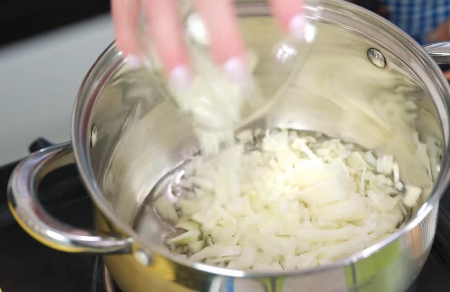 Aby przygotować zupę, weź odpowiednią patelnię i umieść ją na kuchence, a następnie wlej do niej około trzech łyżek oleju roślinnego i rozłóż jedną główkę wstępnie drobno posiekanej cebuli, którą następnie wymieszaj i smaż, aż będzie przezroczysta w wysokiej temperaturze pieca.