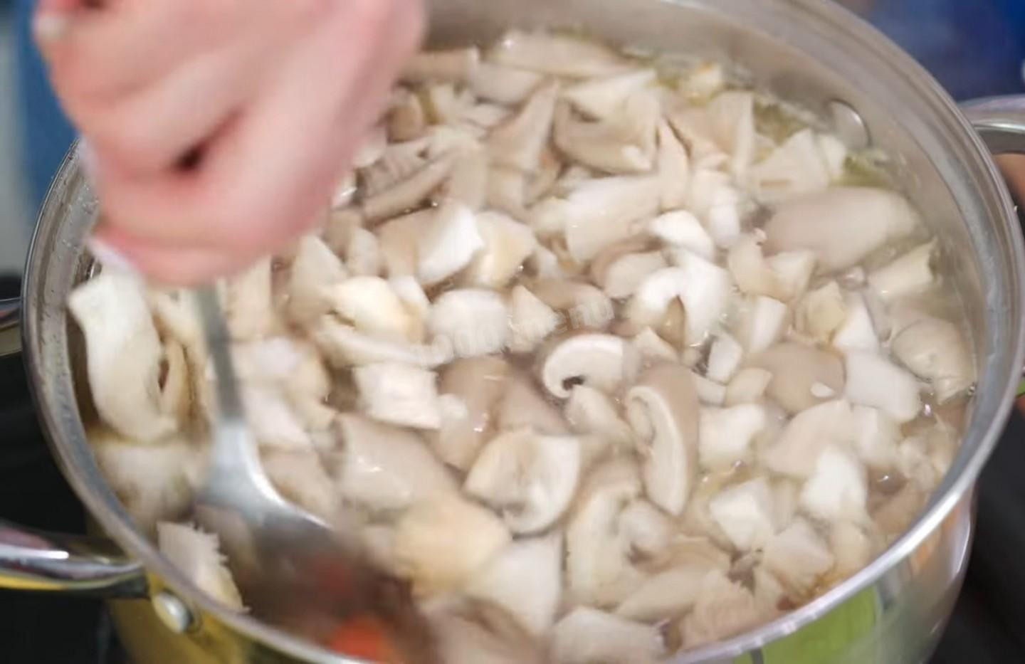 Włóż pokrojone grzyby do rondla z gotowaną zupą, a następnie wymieszaj wszystkie składniki i ponownie zagotuj zupę w wysokiej temperaturze pieca.