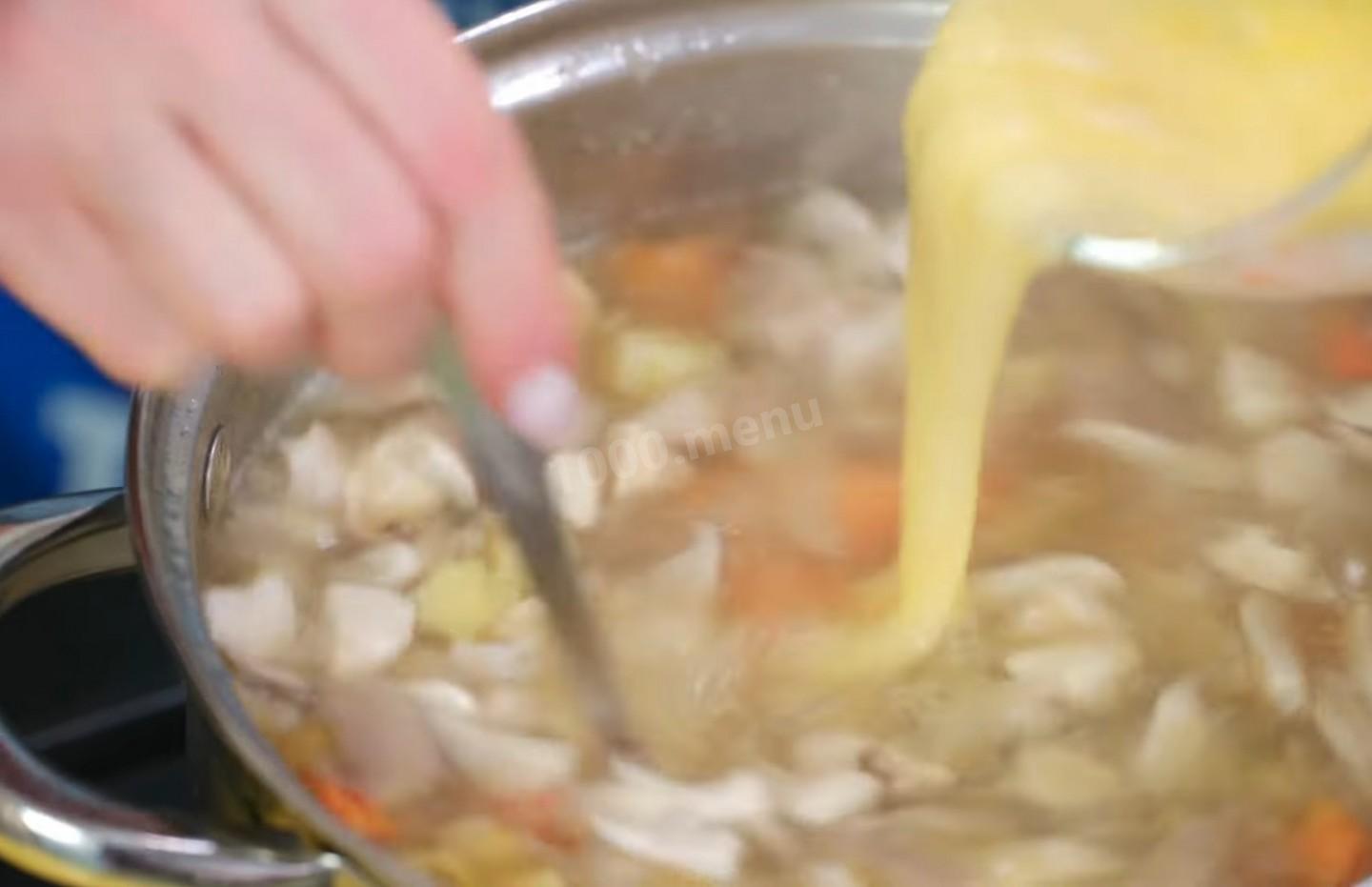 Weź małą miskę i rozbij do niej jedno jajko kurze, które następnie ubij na gładką masę i wlej do garnka z gotującą się pięciominutową zupą.