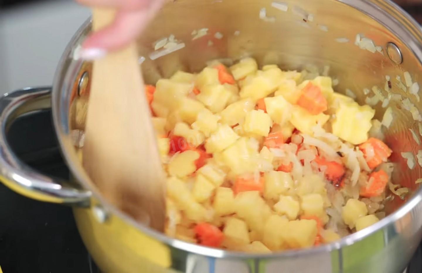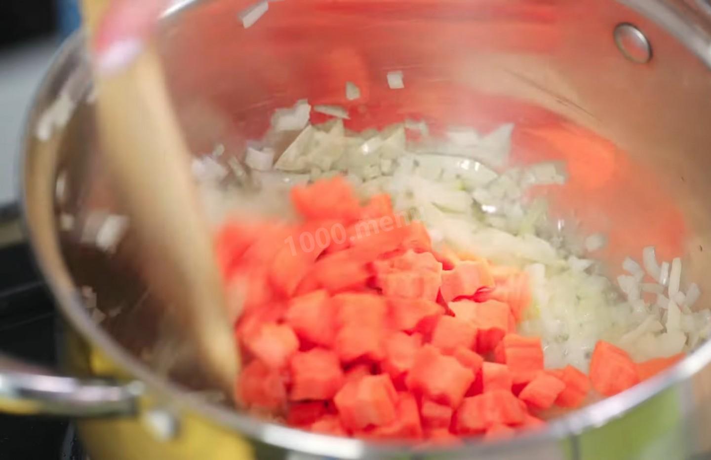 Pokrój połowę średniej marchewki w małą, losową kostkę i włóż do rondla z cebulą, a następnie wymieszaj warzywa i smaż przez dwie minuty w wysokiej temperaturze pieca.