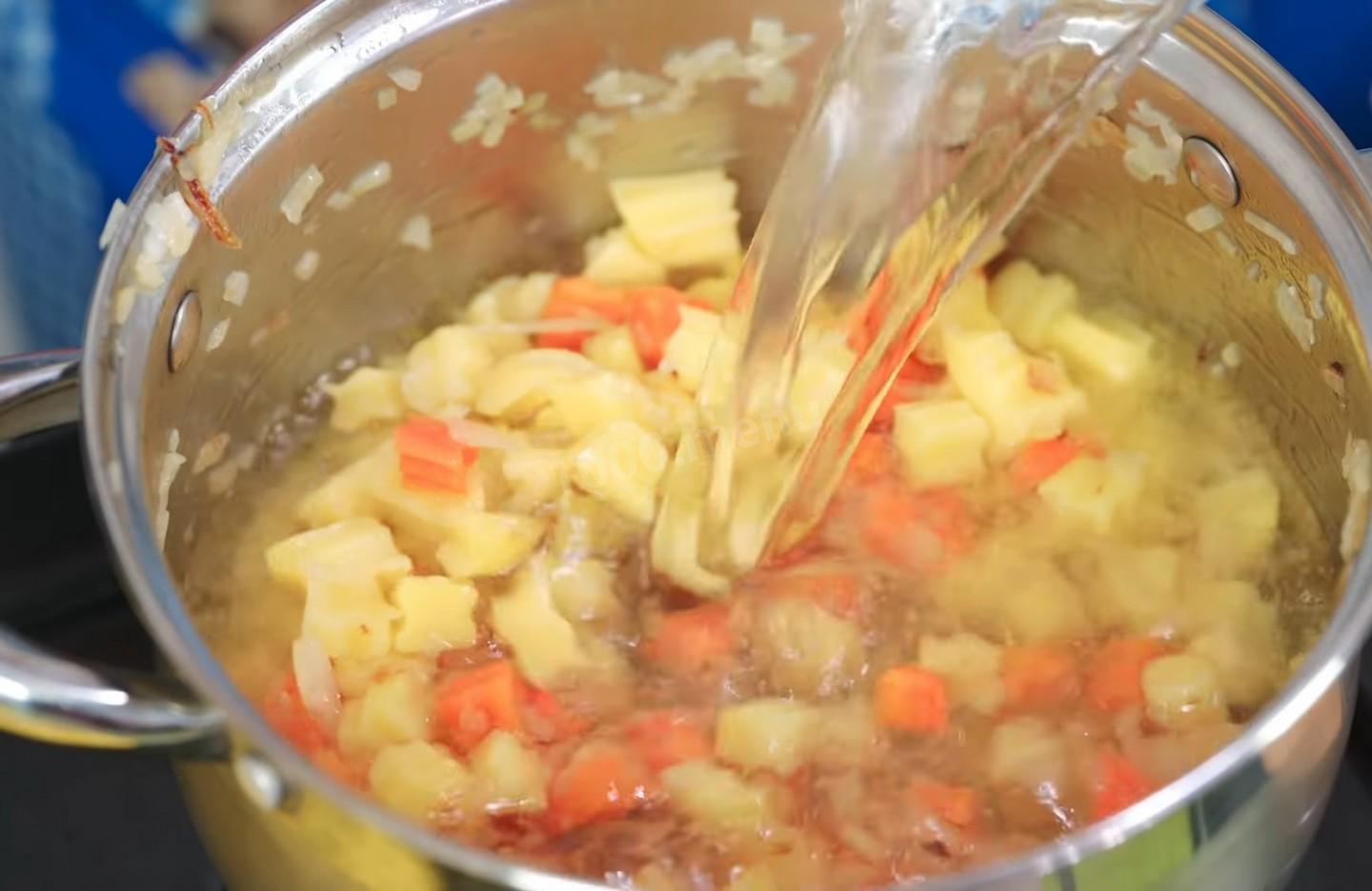 Wlej półtora litra wody do garnka z warzywami i przykryj pokrywką, a następnie zagotuj wodę w wysokiej temperaturze pieca.