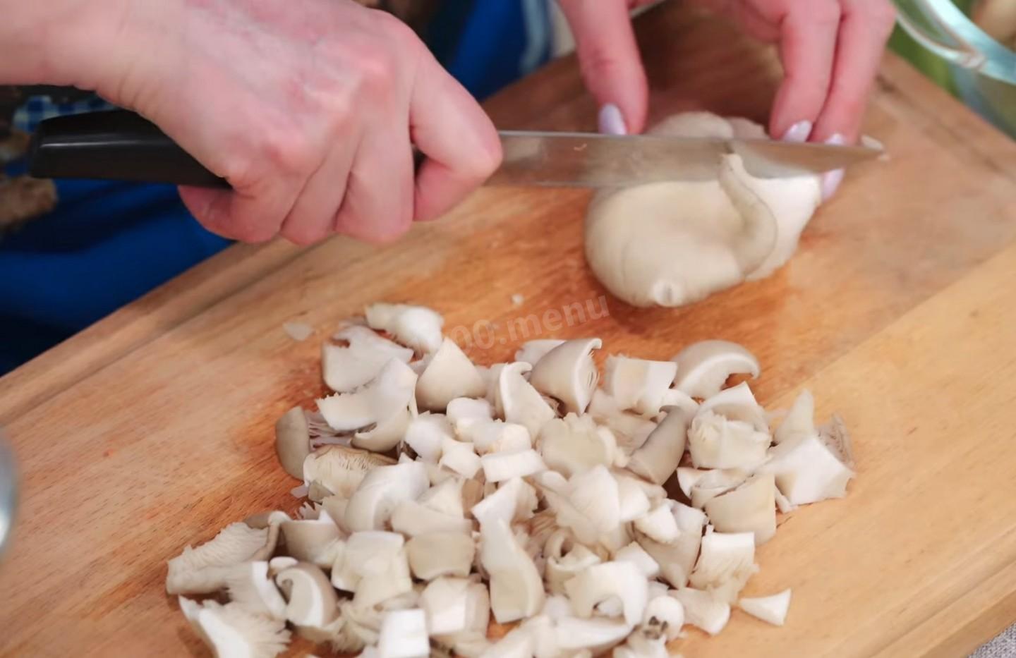 Pokrój trzysta gramów boczniaków na małe, dowolne kawałki, które można zastąpić dowolnymi grzybami do smaku.