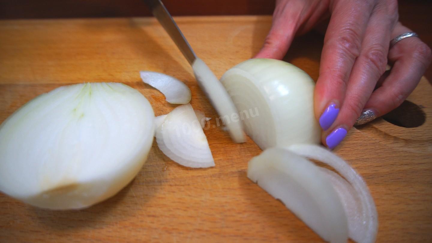 Cebulę kroimy w półpierścienie, układamy na patelni i smażymy na złoty kolor.