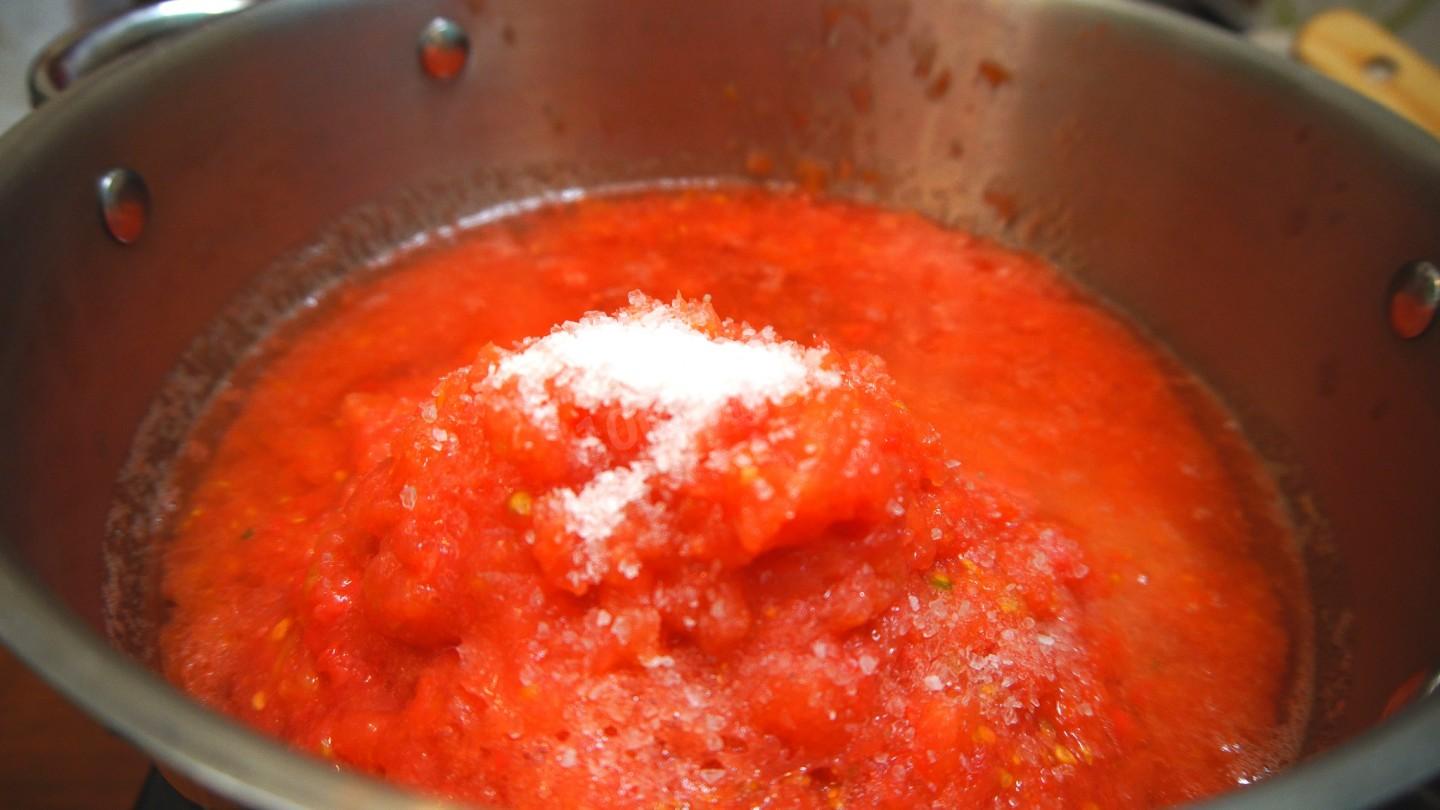 Dodaj sól i cukier do puree pomidorowego z pieprzem.