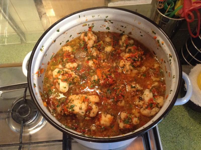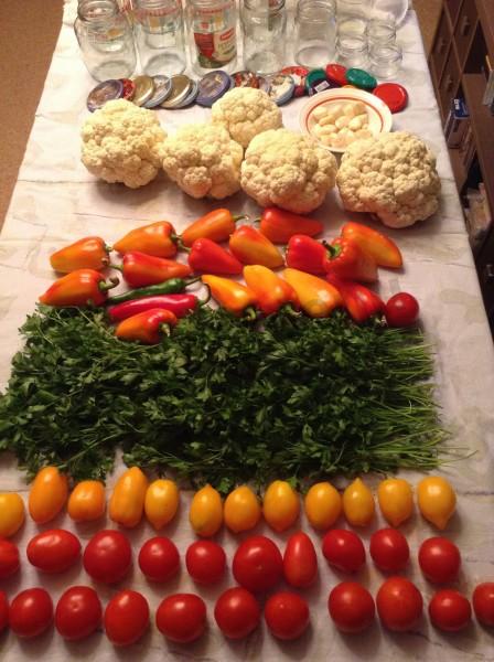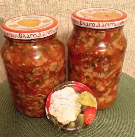 Kalafior zdemontuj na kości i gotuj w osolonej wodzie przez 5 minut. Wrzuć do durszlaka. Przenieś do dużego rondla. Obierz paprykę z nasion, obierz czosnek i podziel na plasterki. Przełóż przez maszynę do mięsa (lub zmiel w blenderze) pomidory, paprykę, pietruszkę i czosnek. Wlej tę mieszaninę do kalafiora. Dodaj olej roślinny, ocet, sól i cukier.