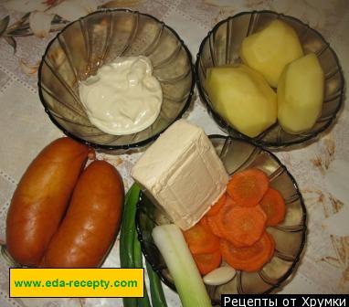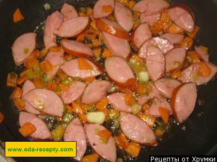 umieść garnek z wodą na kuchence, zagotuj i opuść ziemniaki. Podczas gotowania ziemniaków zróbmy smażenie. Smażyć pory na oleju roślinnym, wlać kawałki kiełbasek, smażyć trochę. Dodaj marchewki i smaż wszystko przez 5 minut.