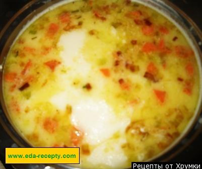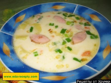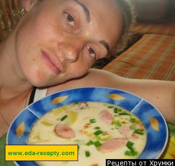 Serki kroimy w poprzek. 20 minut po ugotowaniu zanurz ser w ziemniakach. Po stopieniu sera dodaj smażenie, gotuj przez pięć minut, sól do smaku, posyp świeżymi ziołami. Wyłącz ogień, dodaj czosnek i kilka łyżek kwaśnej śmietany. Zupa jest gotowa.
