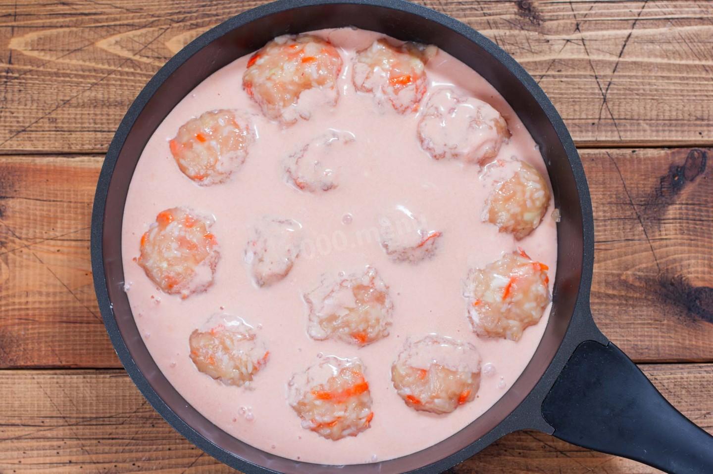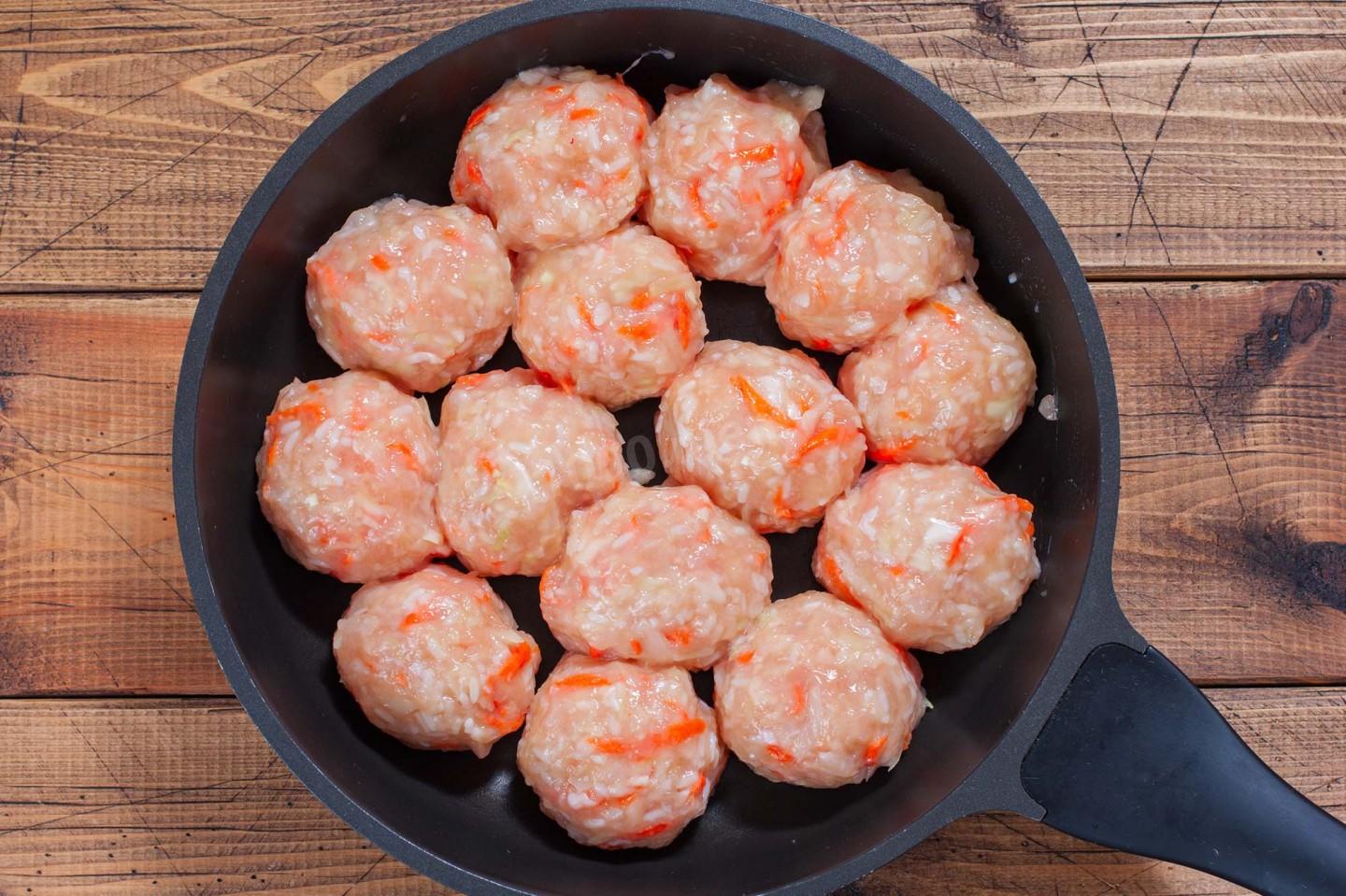Mokrymi rękami uszczypnij mięso mielone i zwiń zaokrąglone średniej wielkości klopsiki, takie jak klopsiki. Rozłóż je na wybranej patelni, dość ciasno do siebie. Nie trzeba dodawać oleju do patelni, ponieważ klopsiki będą duszone w sosie bez wcześniejszego smażenia.
