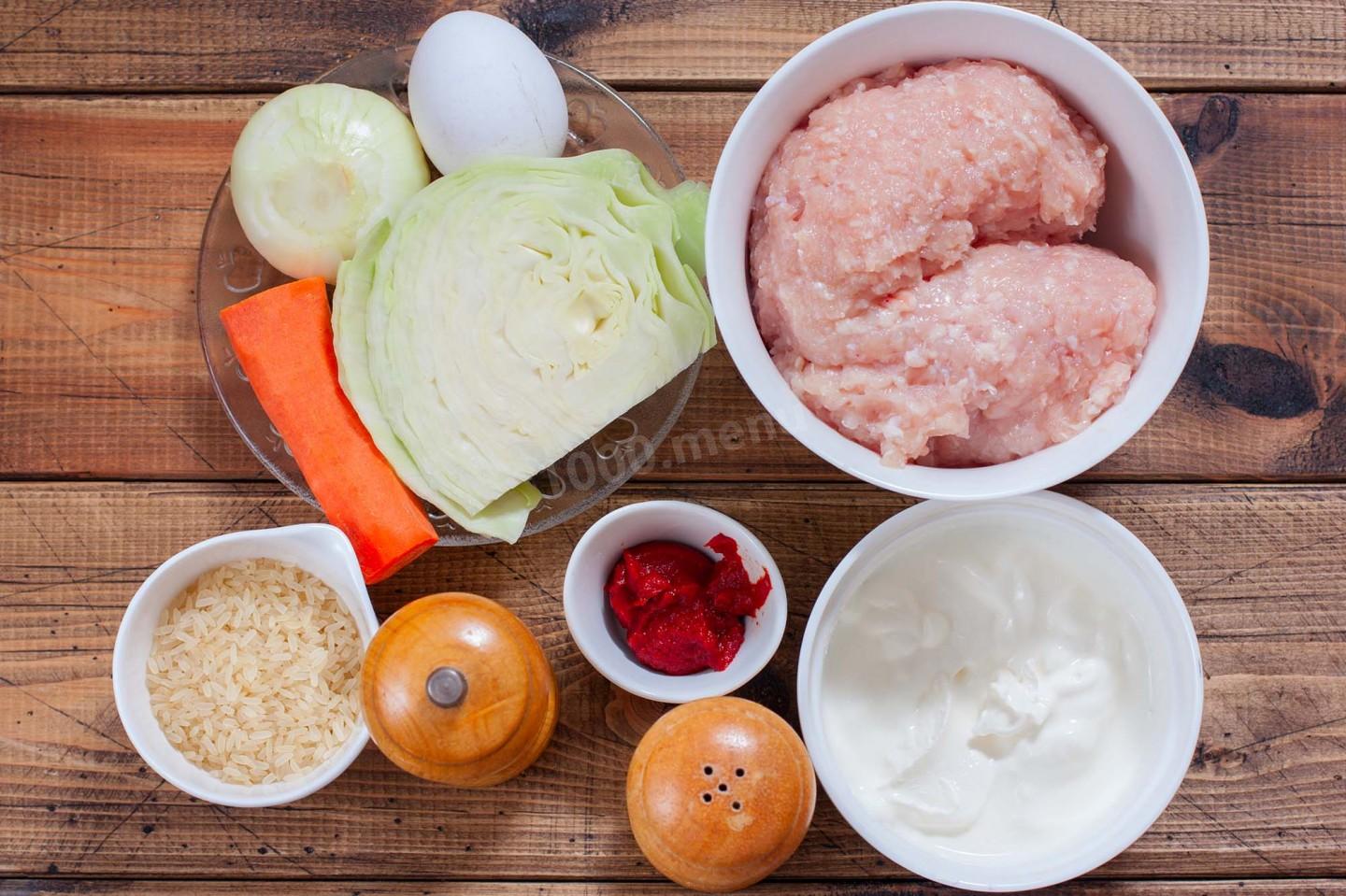 Jak zrobić leniwe gołąbki z mielonym mięsem i ryżem na patelni? Bierzemy niezbędne produkty. Lepiej jest wziąć młodą kapustę, więc czas gotowania gołąbków zostanie skrócony. Cebula i marchewka są małe. Ryż gotowany na parze. Koncentrat pomidorowy można zastąpić sosem pomidorowym, keczupem lub pomidorami we własnym soku (każda zmiana ma swoją wagę). Lepiej jest wziąć kwaśną śmietanę (biorę 15%). Mam mielonego kurczaka, możesz użyć dowolnego według własnego gustu.