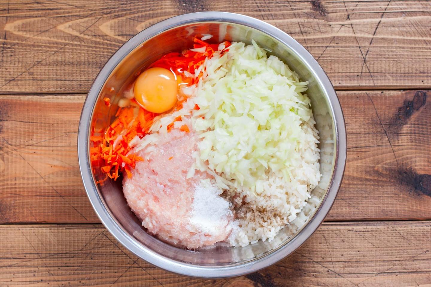 Umyj i posiekaj cebulę i marchewkę-posiekaj cebulę, zetrzyj marchewki na grubej tarce. W głębokiej misce wymieszaj mięso mielone, posiekane warzywa (marchew, cebula, kapusta, płyn spuszczający), półgotowany ryż, jajko kurze, sól i pieprz do smaku. Wszystko dokładnie zagnieść, aż będzie gładkie.