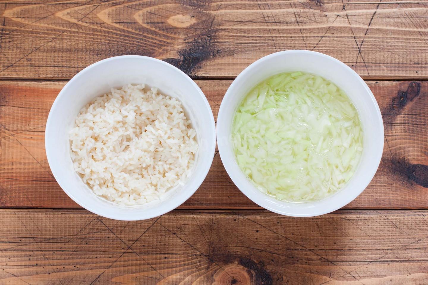 Najpierw musisz ugotować ryż do połowy ugotowany. Aby to zrobić, wlej ryż na parze gorącą wodą, zagotuj i wyłącz ogrzewanie. Odcedź płyn i pozostaw ryż do ostygnięcia. Posiekaj świeżą kapustę bardzo cienko, posiekaj ją nożem, aby uzyskać niezbyt duże kawałki, zalej posiekaną kapustę wrzącą wodą.