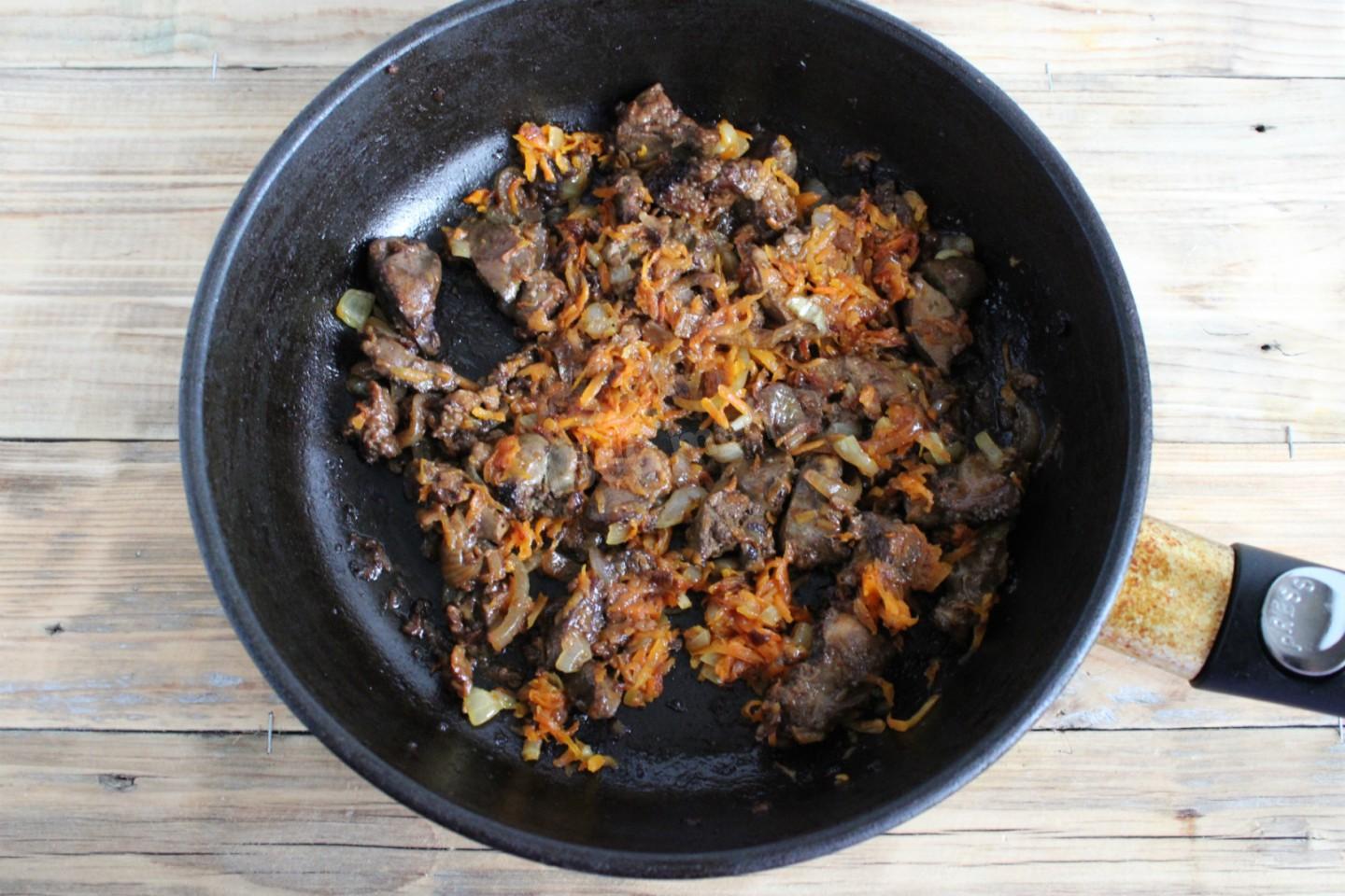 Dodaj marchewki i cebulę na patelnię z wątróbką. Mieszaj i kontynuuj smażenie, zmniejszając ciepło do średniego, aż marchewki będą miękkie, a cebula przezroczysta.