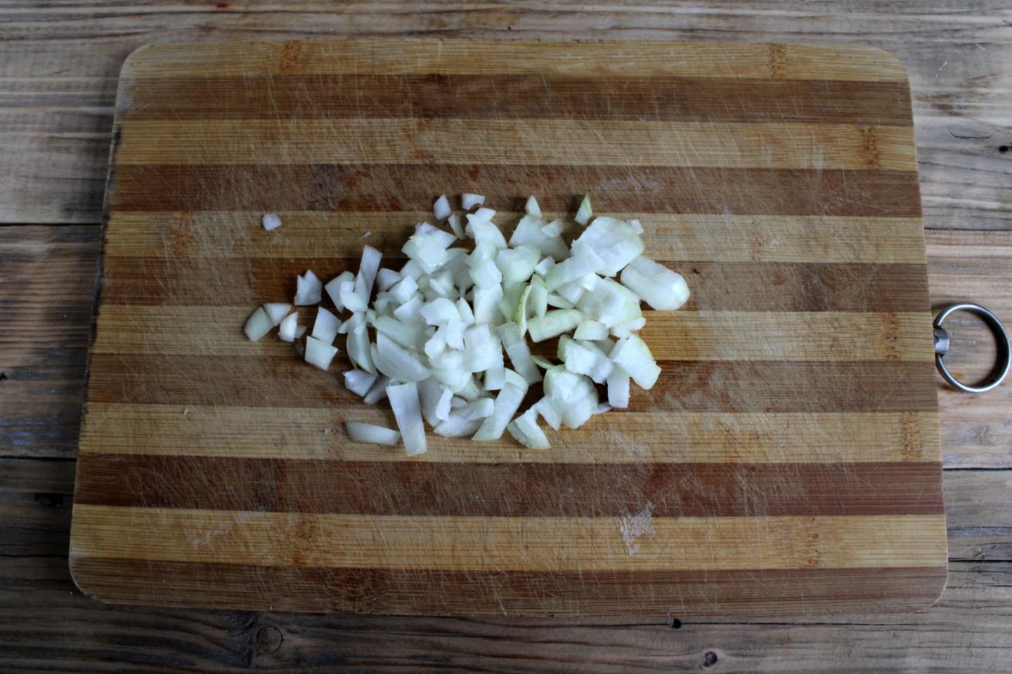 Drobno posiekaj obraną cebulę nożem. Aby zapobiec łzawieniu oczu, okresowo płucz nóż zimną wodą.