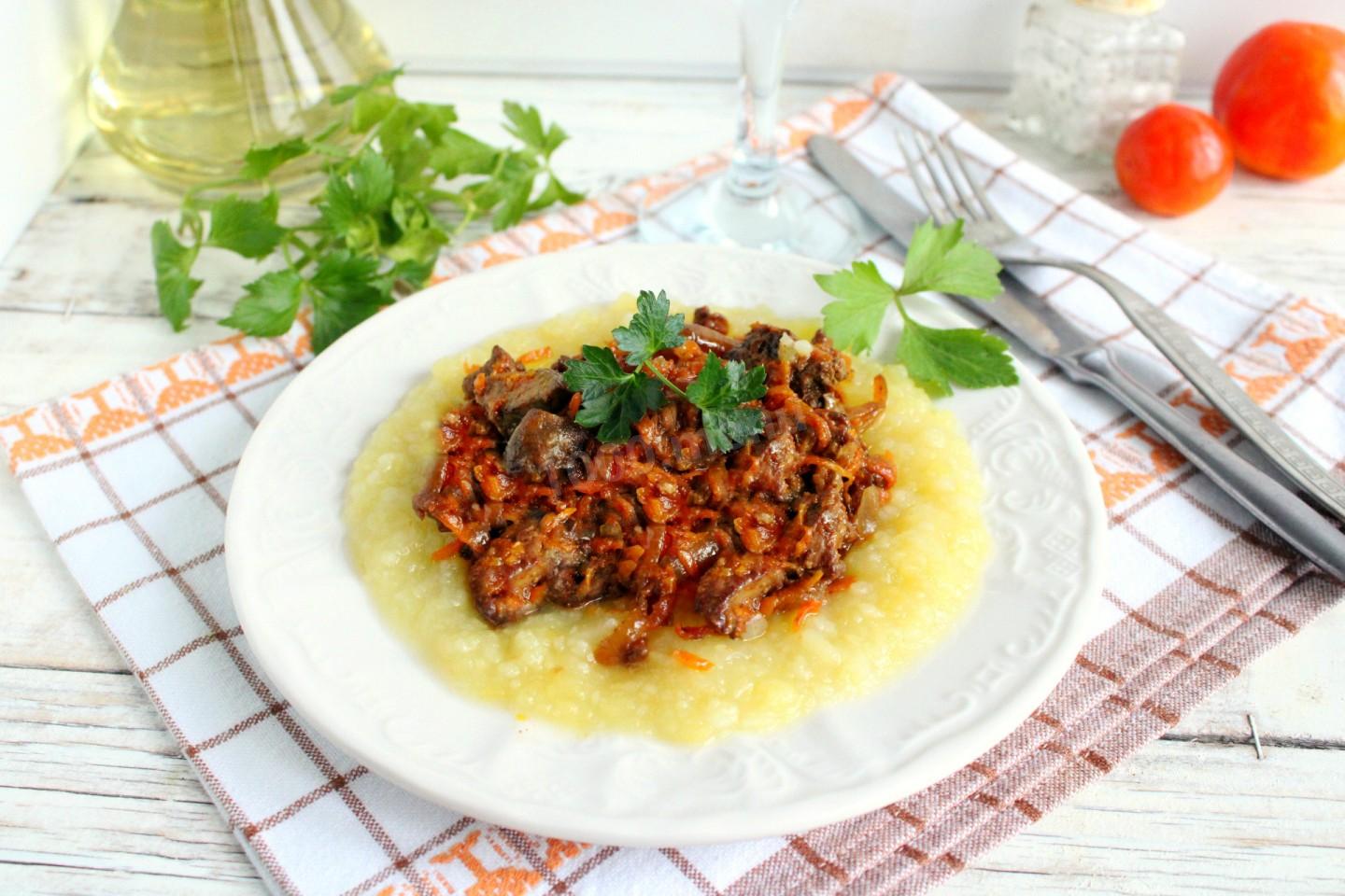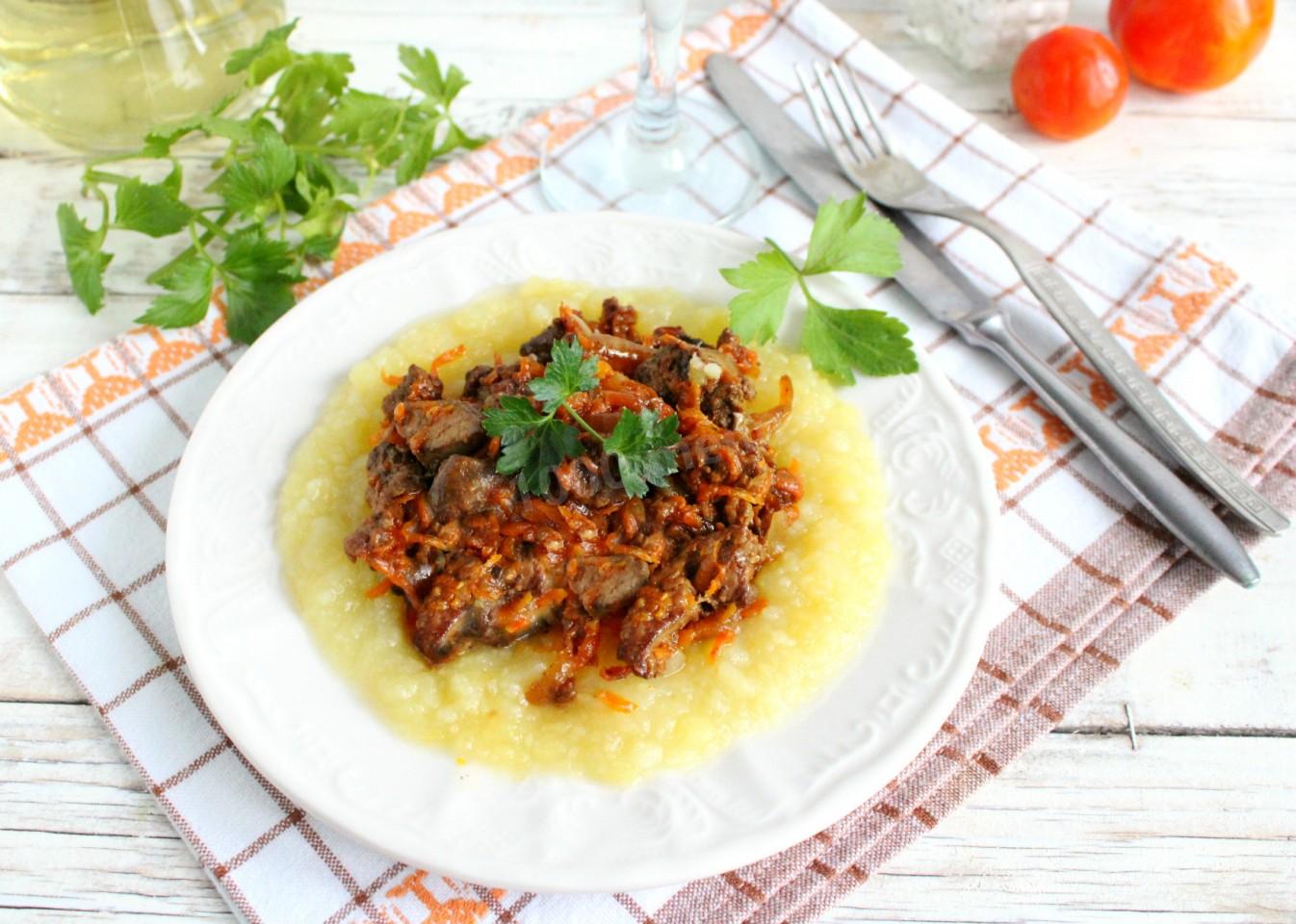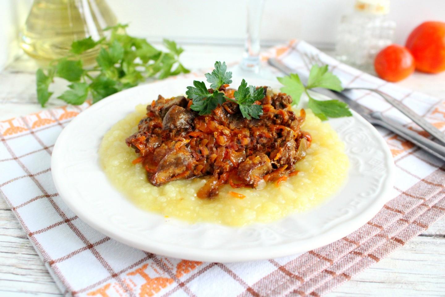 Dodaj sól, czarny pieprz do smaku, w razie potrzeby więcej przypraw i przypraw. Wlej wodę (gorącą lub wrzącą wodę). Zamiast wody możesz użyć bulionu mięsnego lub warzywnego. Wymieszać. Przykryj patelnię pokrywką, zmniejsz ogień do minimum i gotuj na wolnym ogniu przez około 15-25 minut, aż nadmiar wilgoci wyparuje. Czas zależy od twojego pieca. Danie jest gotowe. Podawaj wątrobę na stole z dowolnym dodatkiem, z kaszą gryczaną, ryżem lub tłuczonymi ziemniakami. Smacznego!
