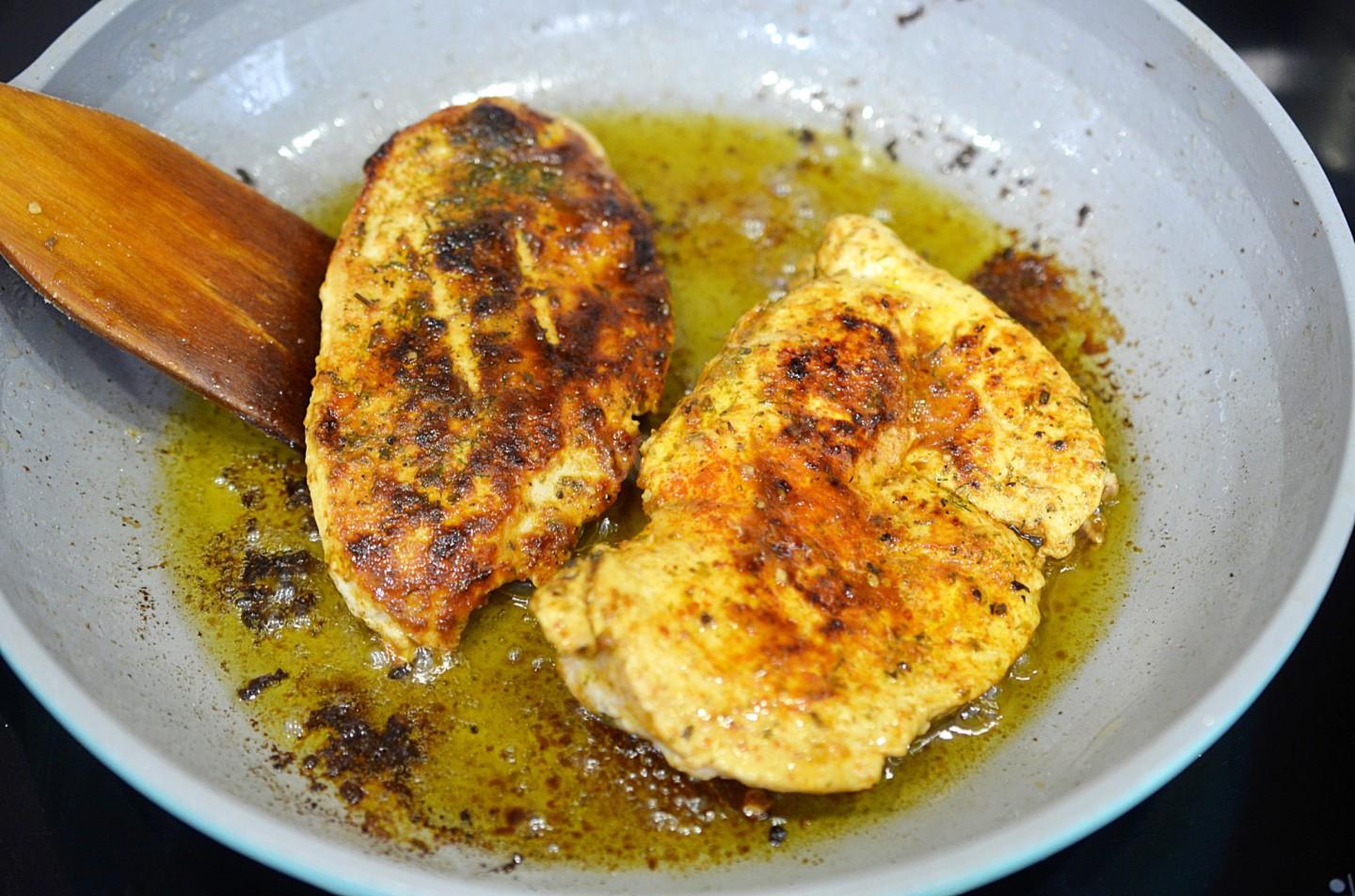 Na patelni dobrze rozgrzej olej roślinny, ułóż piersi, smaż przez 5-7 minut z każdej strony na małym ogniu. Jeśli masz patelnię grillową lub patelnię z powłoką nieprzywierającą, całkiem możliwe jest smażenie piersi bez użycia oleju, co jest zdecydowanie zdrowsze.