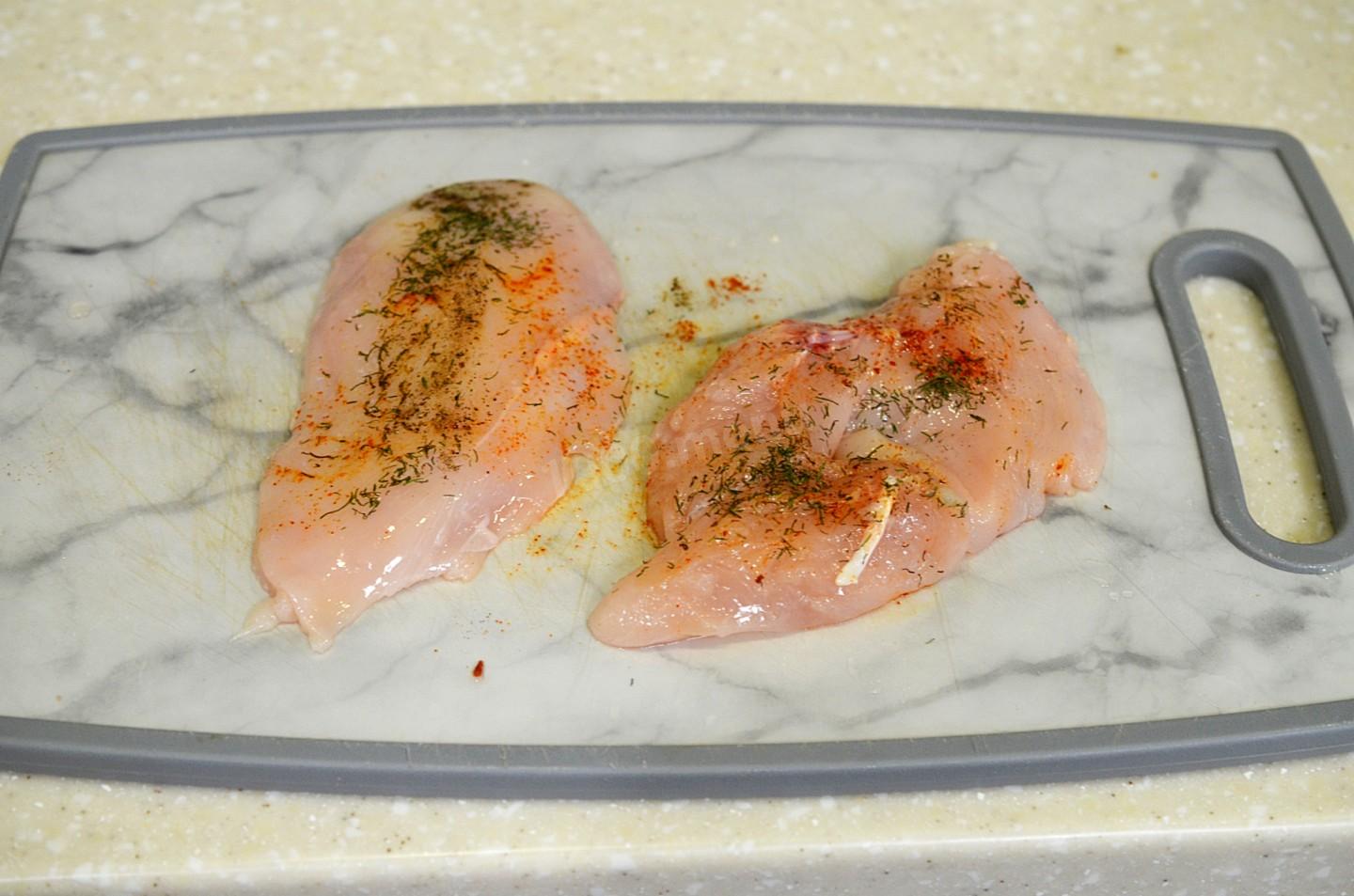 Jak usmażyć soczyste piersi z kurczaka na patelni? Lepiej jest wziąć filet z piersi kurczaka, Jak to często robię, ale możesz też mieć pierś z kością. Schłodzone są lepsze niż mrożone. Możesz wyciąć piersi z tuszy kurczaka. Wszystkie przyprawy i przyprawy są suszone, ale jeśli chcesz, możesz użyć świeżego koperku i czosnku. Każdy olej roślinny: od oliwy do kukurydzy, ale musi to być rafinowany olej, aby uniknąć jego spalania.
