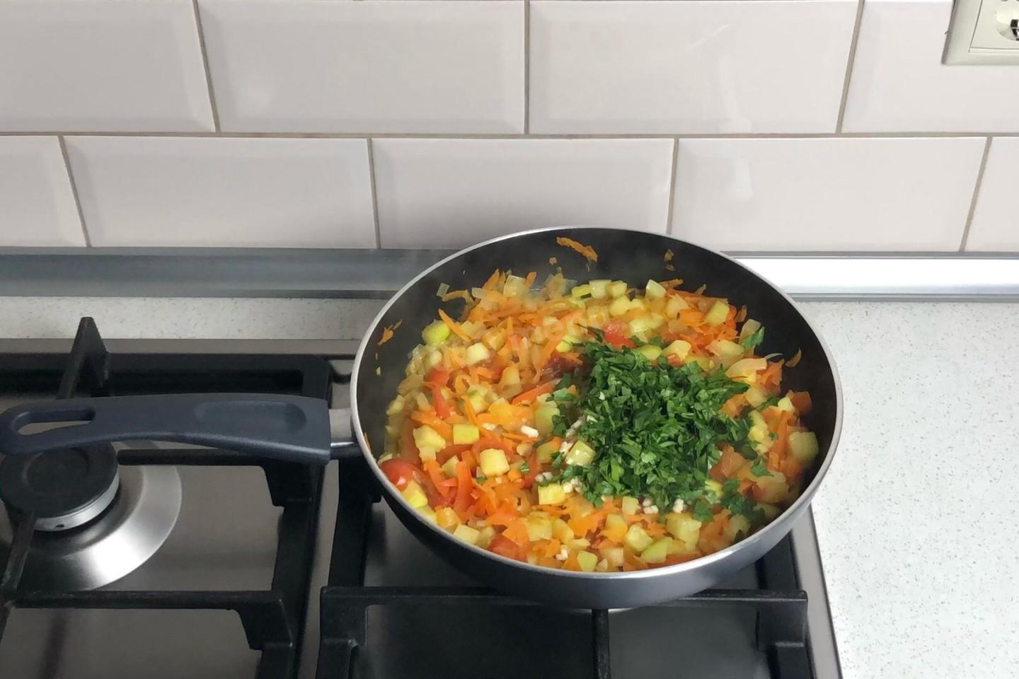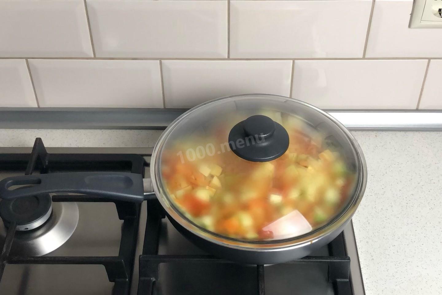 Teraz ponownie zamknij patelnię i zmniejsz ogień, pozwalając warzywom nasycić się nawzajem aromatami i osiągnąć gotowość. Skoncentruj się na stanie cukinii — jeśli jest gotowa, wyłącz ją. Młoda cukinia gotuje się szybciej niż stara, nie zapomnij, bo dostaniesz owsiankę. To wszystko, nasze danie jest gotowe, smacznego!