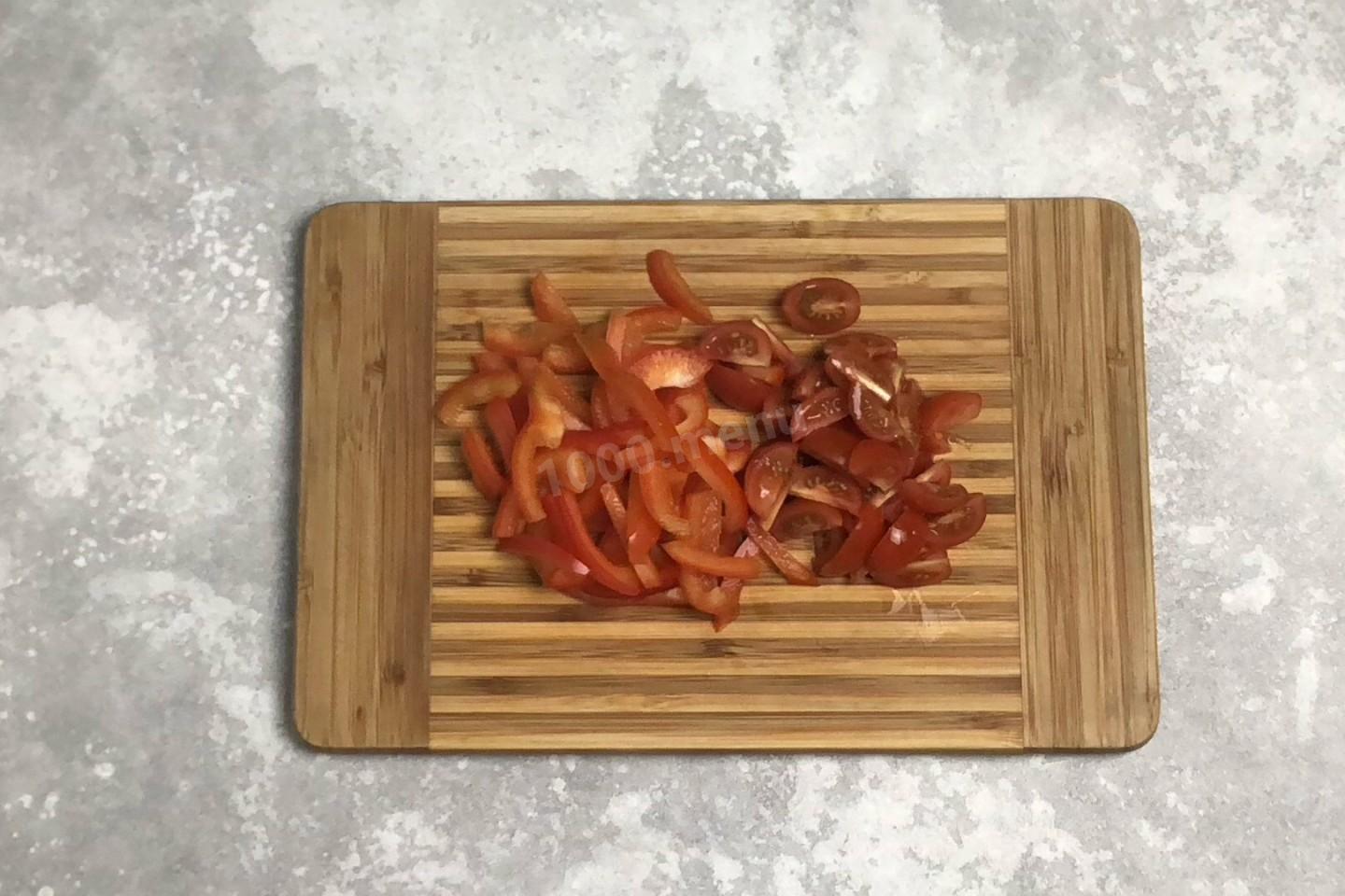Paprykę pokroić w paski, pomidory na małe plasterki. Jeśli wziąłeś zwykłego pomidora, lepiej najpierw zdejmij z niego skórkę. Aby to zrobić, pokrój go na krzyż i zanurz we wrzącej wodzie na minutę. A następnie natychmiast włóż do zimnej wody. Wtedy skóra jest bardzo łatwa do usunięcia, konieczne będzie pociągnięcie jej wzdłuż wykonanych cięć. Pokrój dużego pomidora w drobną kostkę.