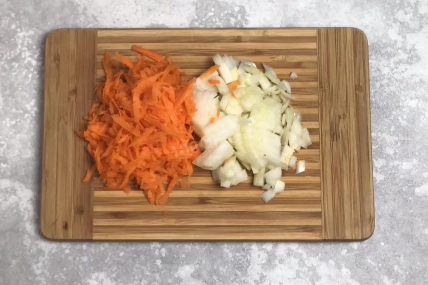 Umieść patelnię na ogniu, podgrzej na małym ogniu. Wlej do niego olej roślinny. Najpierw włóż cebulę i marchewkę na patelnię. Smaż je przez 5 minut, ciągle mieszając. Cebula powinna stać się przezroczysta, a marchewki zmiękną.