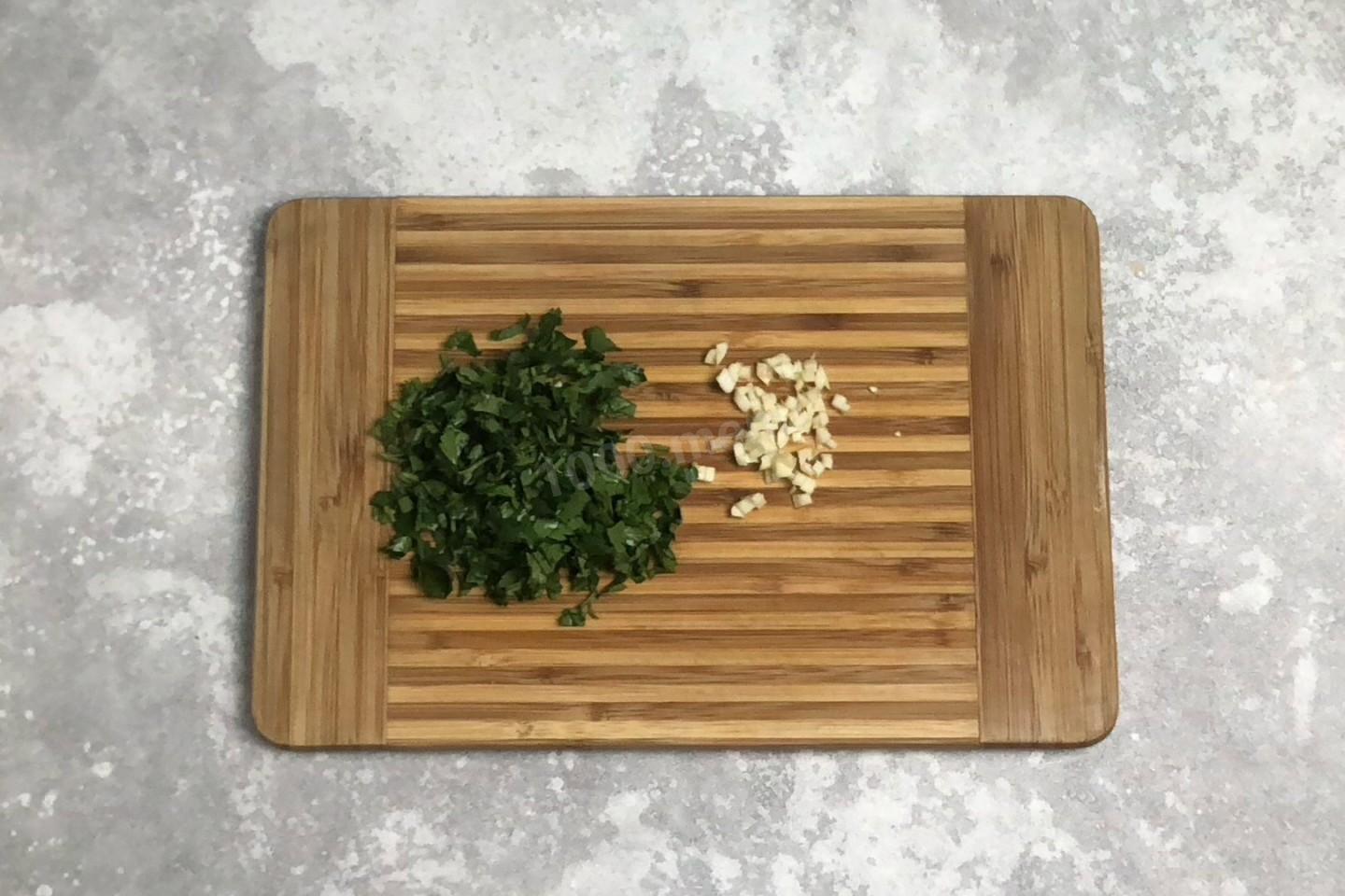 Posiekaj również zioła i czosnek. Zieloni wybierz tę, którą kochasz. Mam pietruszkę.